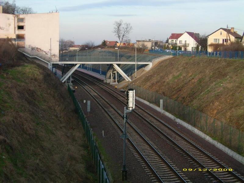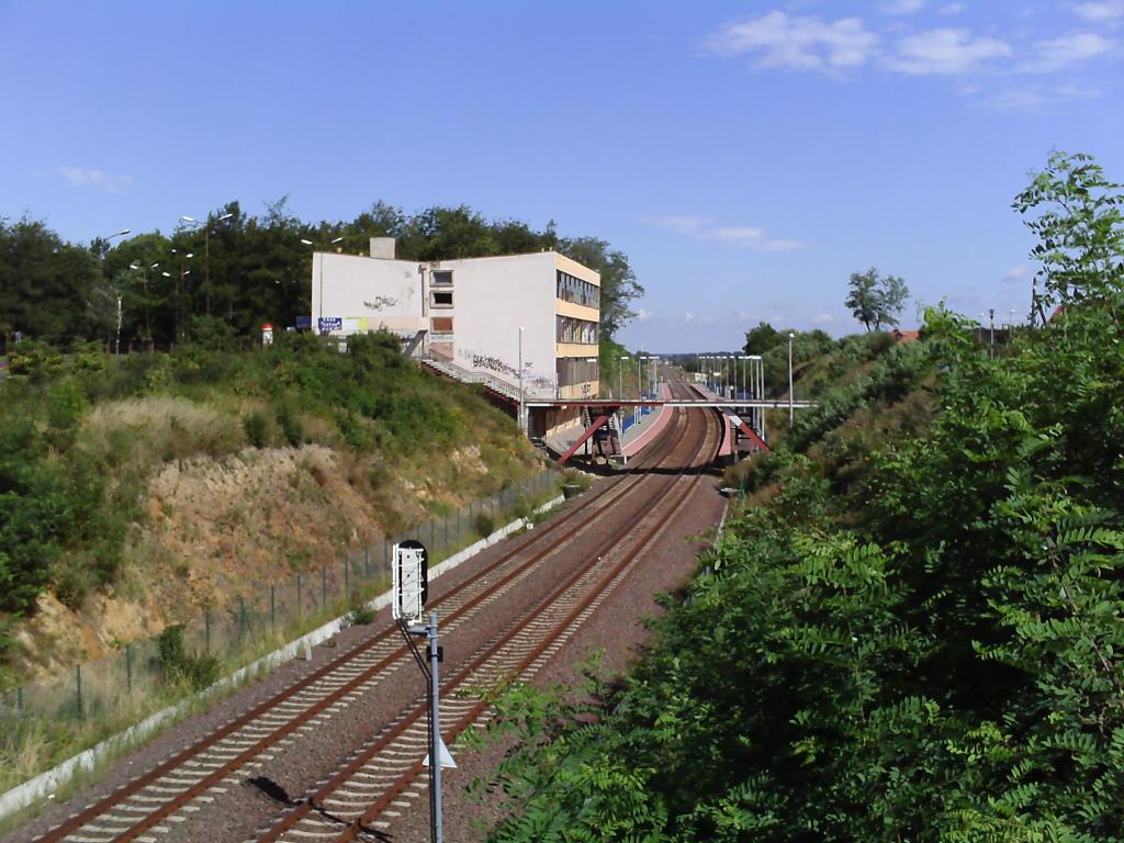 Dworzec kolejowy i kładka nad torami od strony wjazdów ze stacji Zgorzelec (Ujazd) i Jerzmanek/Lubania Śląskiego. Widok w kierunku północno-zachodnim.
