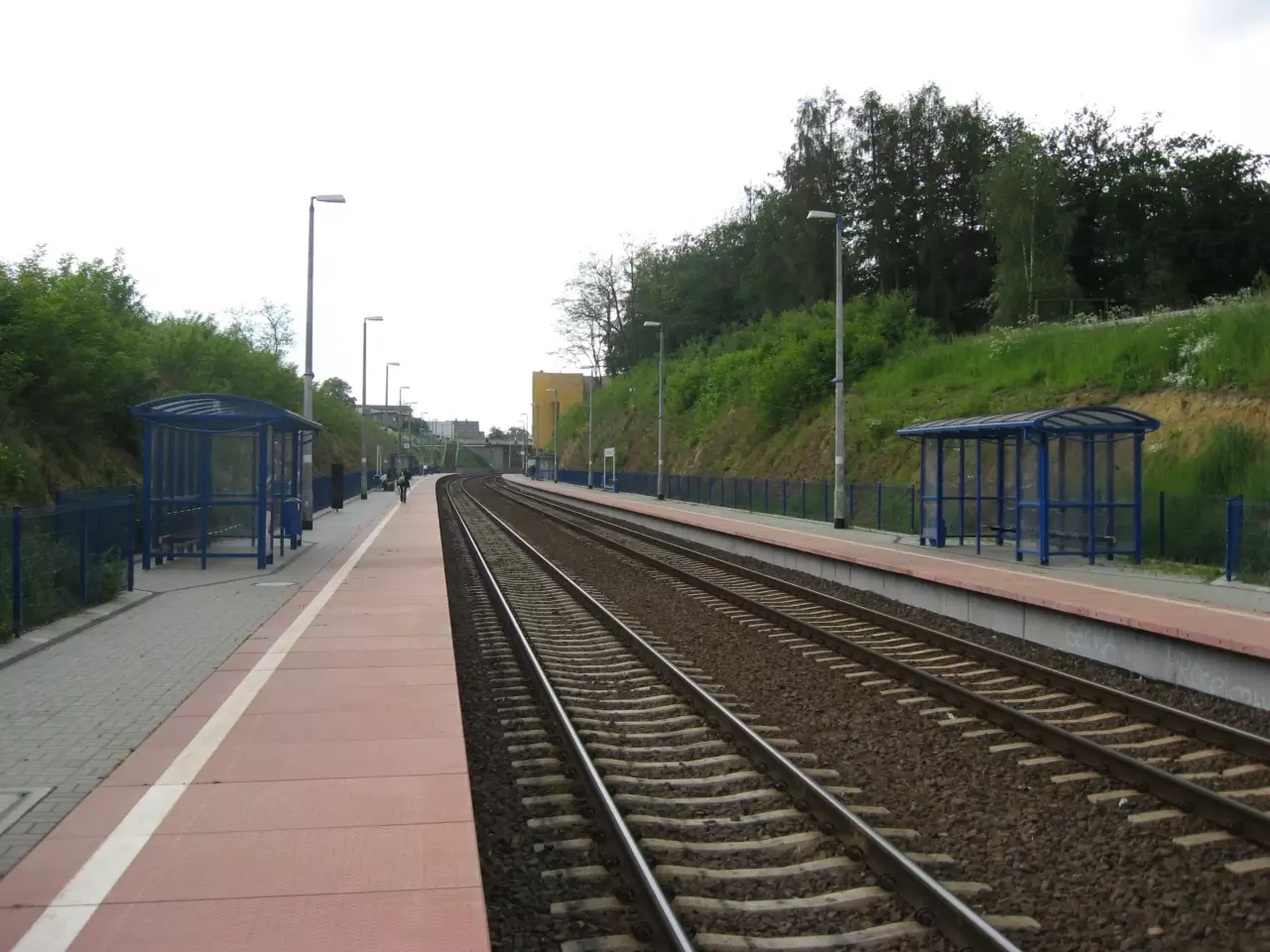 Wyjazd w kierunku południowym: stacja Zgorzelec (Ujazd) i Jerzmanki/Lubań Śląski. W tle wiadukt kolejowy w ciągu ul. Armii Krajowej.