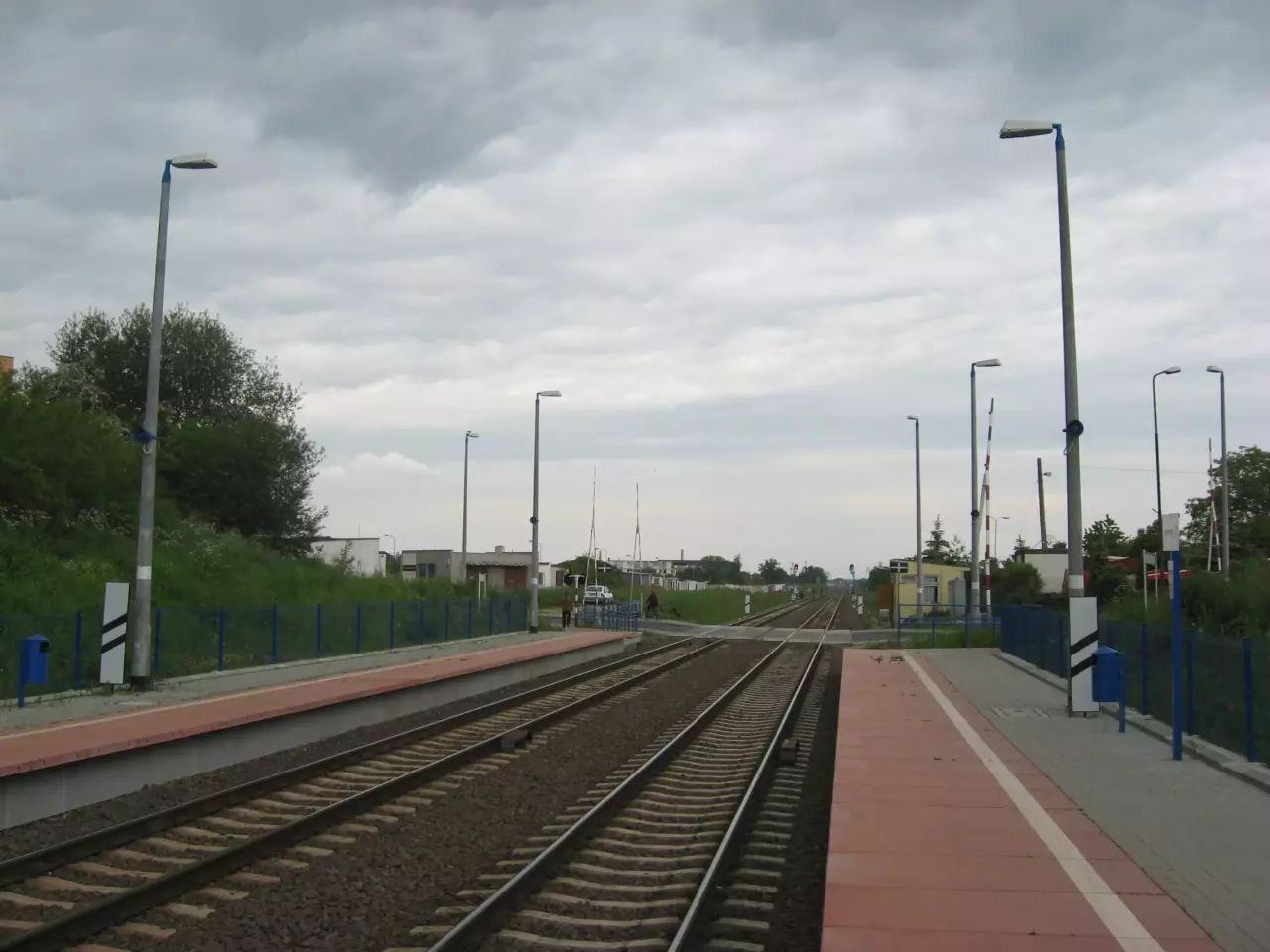 Początek zmodernizowanych peronów od strony wjazdu z Węglińca. Widok w kierunku południowym.