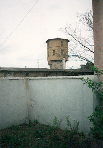 Wieża ciśnień i obecna "zajezdnia" dla drezyn motorowych. Widok od strony wjazdu z Worowa/Stargardu, w kierunku północno-wschodnim.