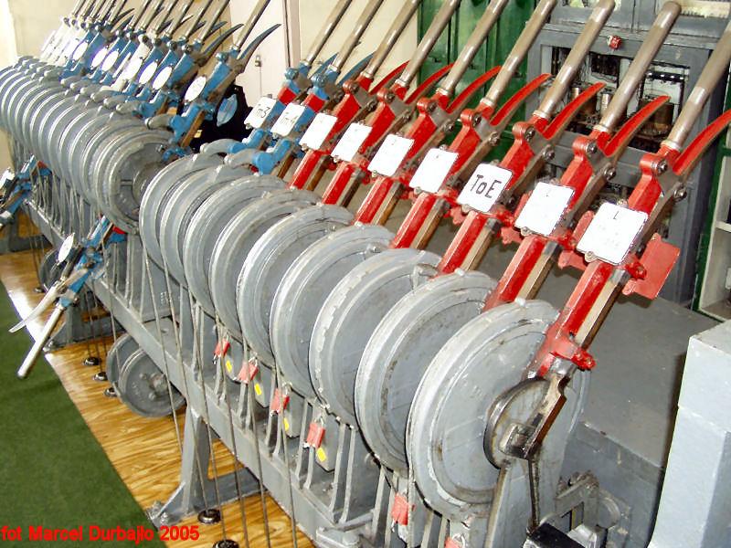 W nastawni Sw1. Ława nastawnicza; czerwone dźwignie dla semaforów, niebieskie - dla napędów zwrotnicowych.