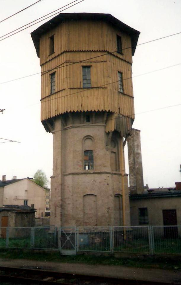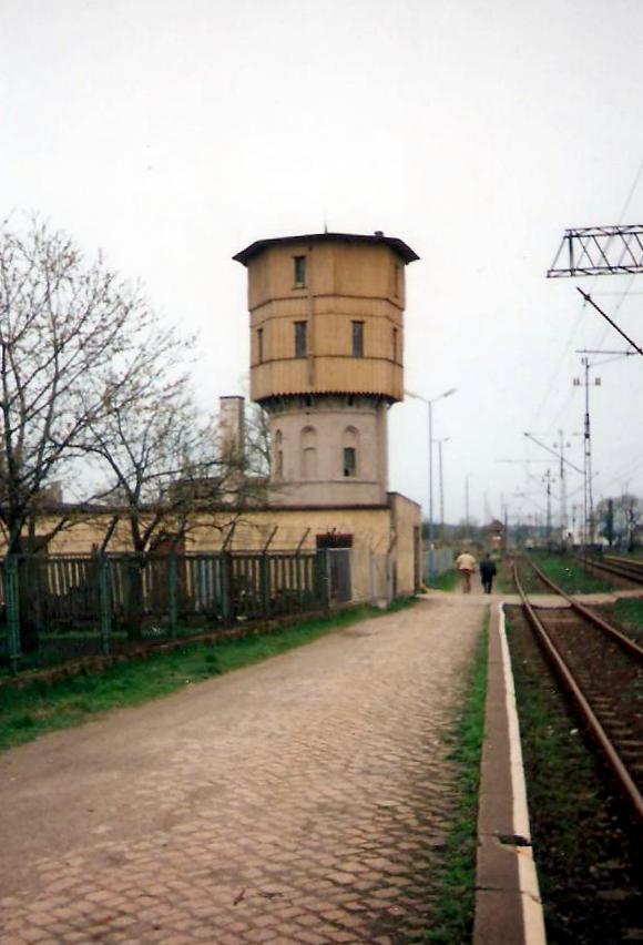 Świdwin. Kolejowa wieża wodna, widok w kierunku dworca kolejowego (Białogardu), widoczna wiata przy przejściu podziemnym.