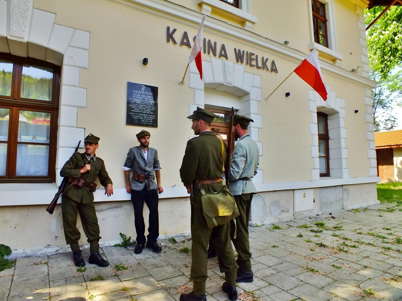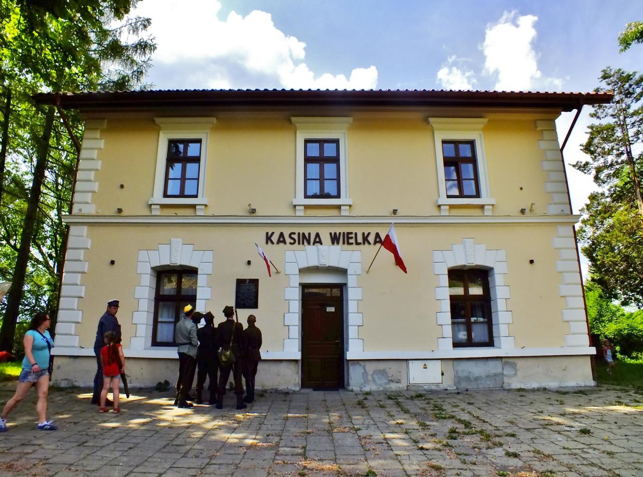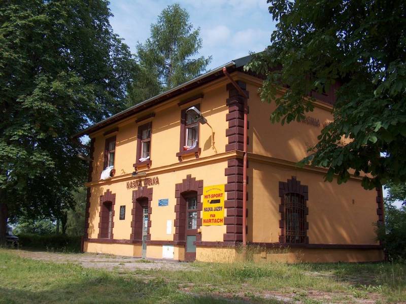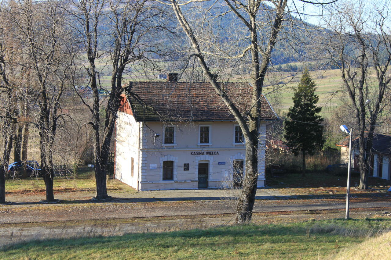 Pozostałości toru głównego dodatkowego na stacji Kasina Wielka. Widok od strony Chabówki. Budynek dworca znajduje się między drzewami, w środku kadru. Tor dodatkowy na stacji Kasina Wielka jest odkopany i oczyszczony. Na stacji obecnie dokonywany jest oblot składu retro, kursującego w każdy weekend, od ostatniego czerwcowego, do ostatniego sierpniowego weekendu (pomijając ten, kiedy jest Parowozjada), z Chabówki do Kasiny W. i z Kasiny W. do Chabówki. Na zdjęciu: http://bocznice.eu/cpg15x/displayimage.php?pid=18182 oblot składu z trzech Bi i jednego Ci na stacji Kasina Wielka, w dniu 2015.07.11. Oblatuje OKz32-2.