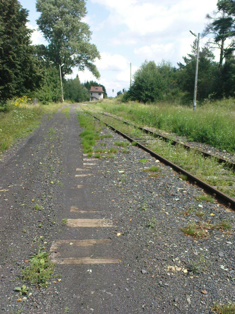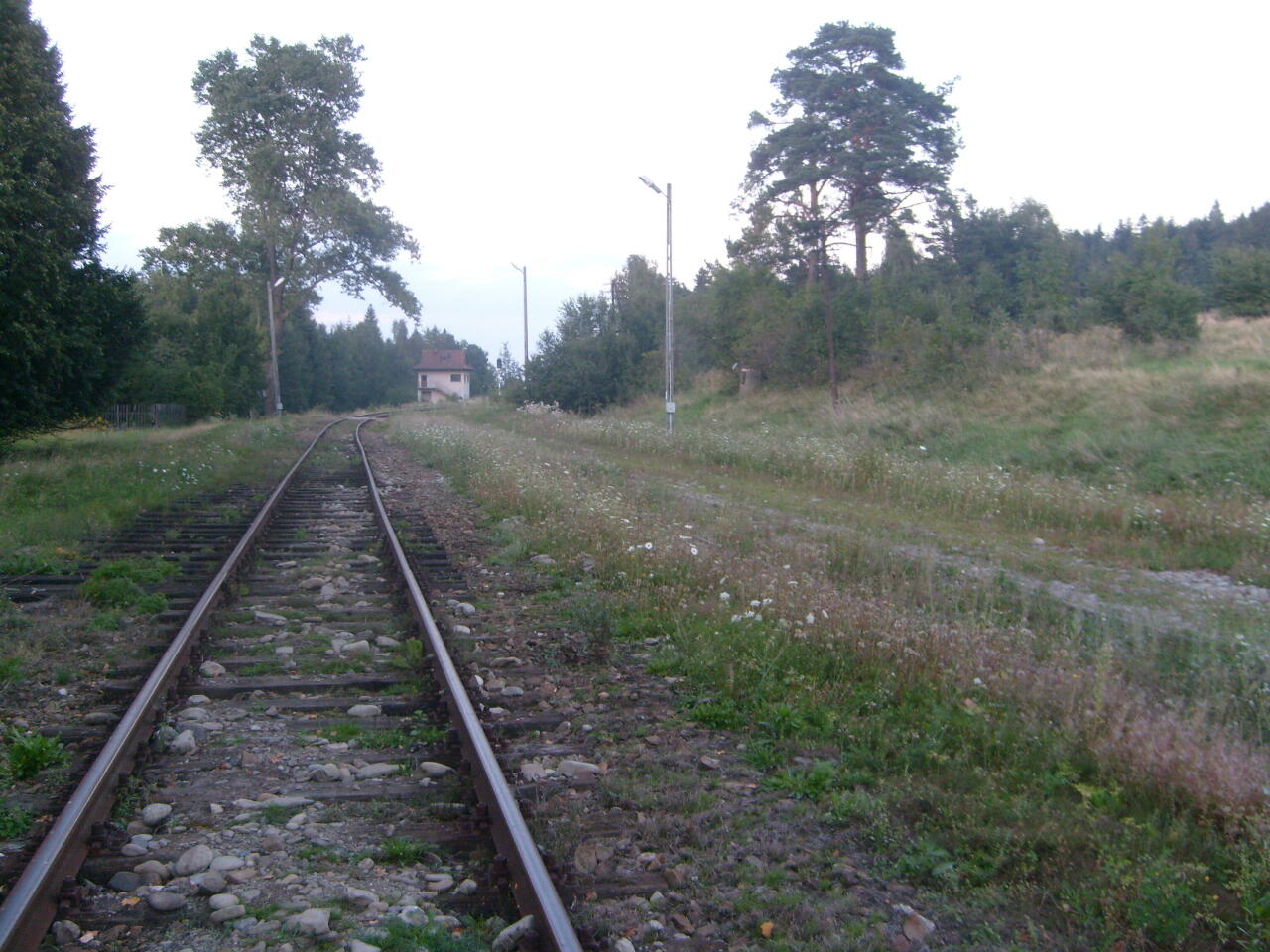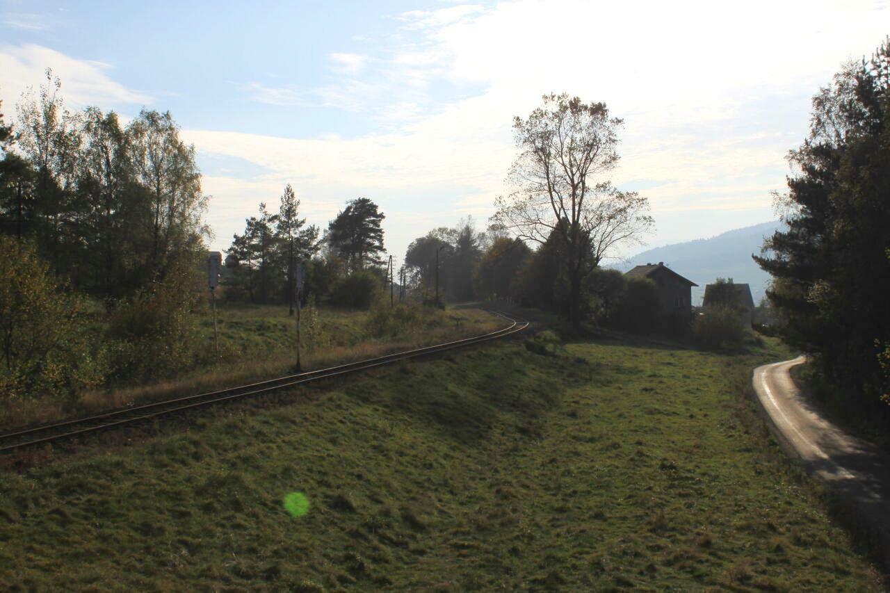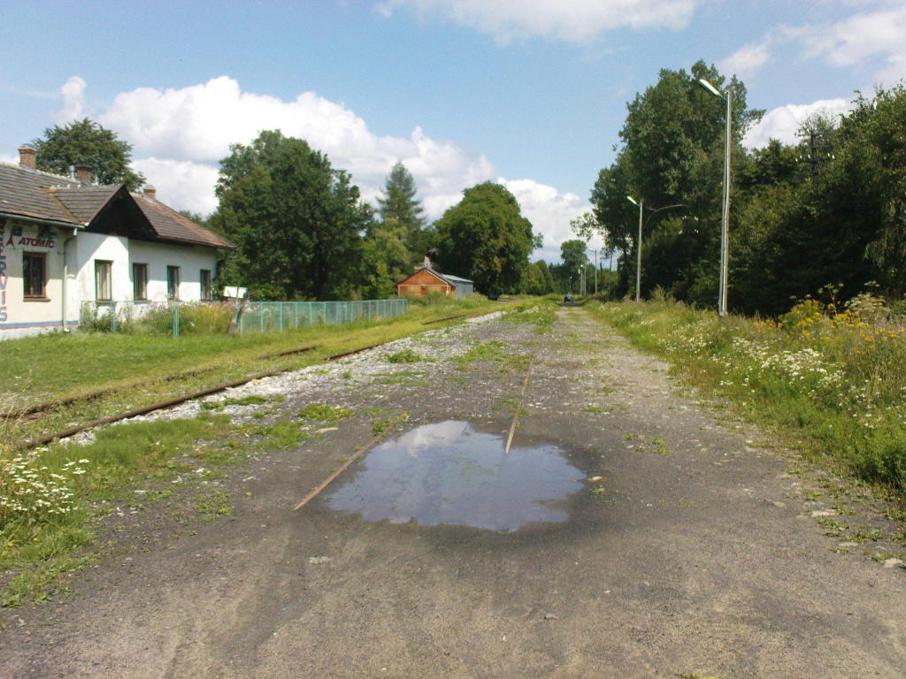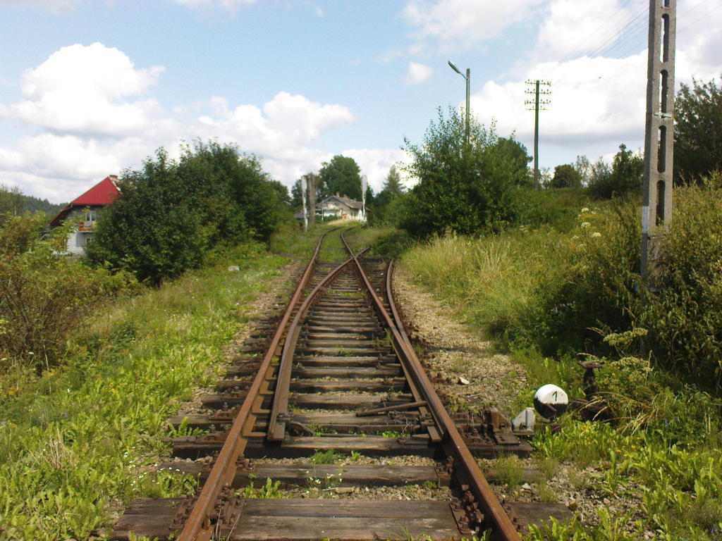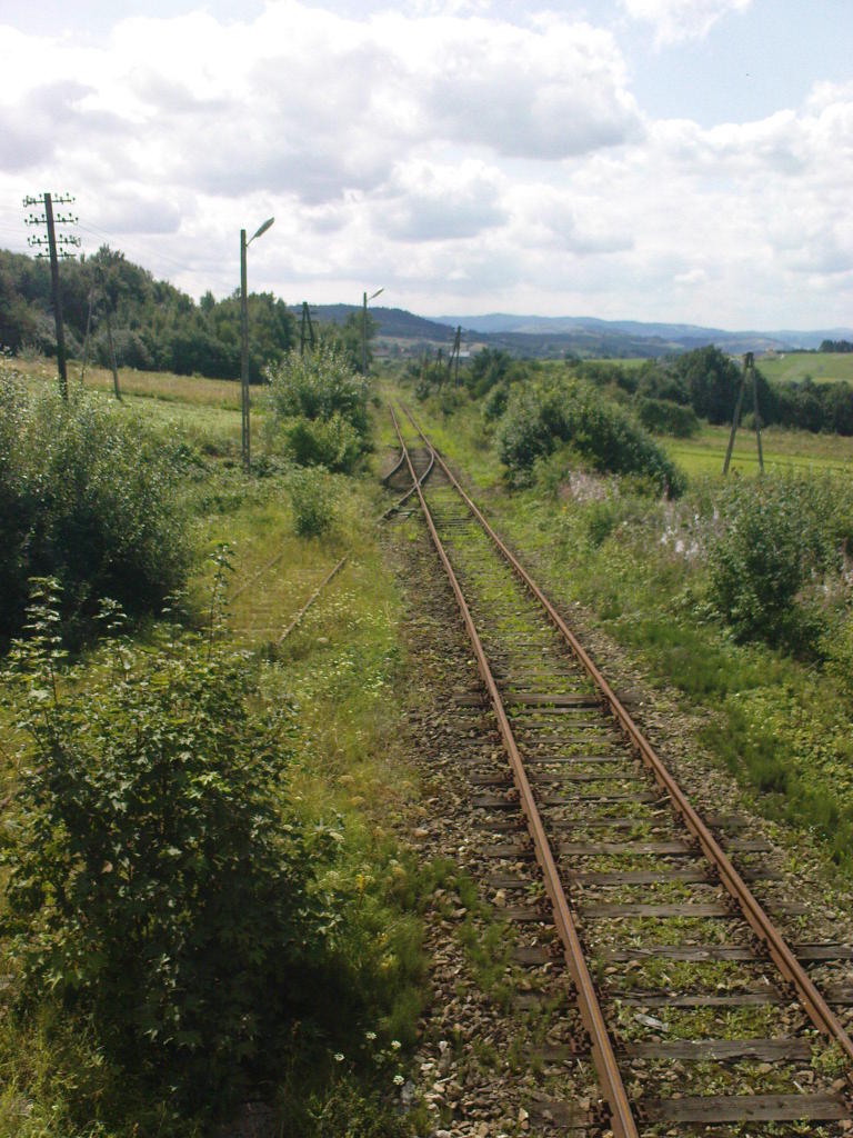 Widok od strony Chabówki na plac ładunkowy. Na pierwszy planie widoczne podrozjezdnice rozebranego rozjazdu.