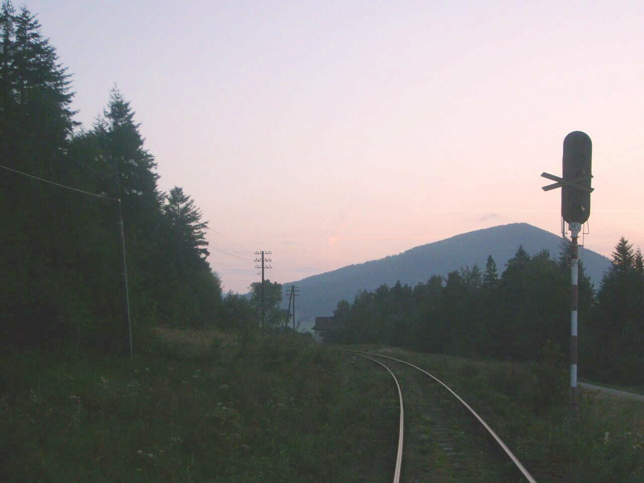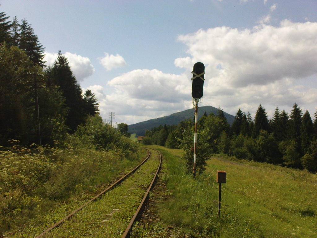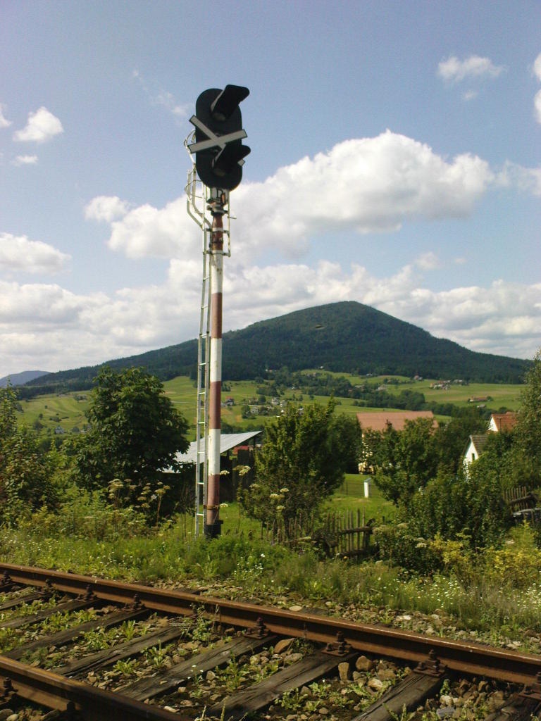Unieważniony semafor wyjazdowy D przy torze głównym zasadniczym, w kierunku Chabówki, na tle masywu Lubogoszcza.