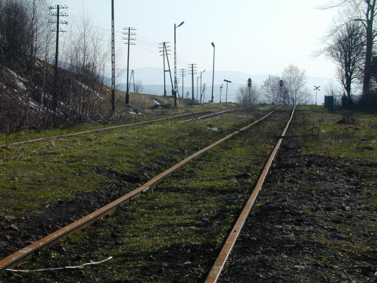 Tory stacyjne; w tle nieczynne semafory wyjazdowe. Widok w kierunku Chabówki.