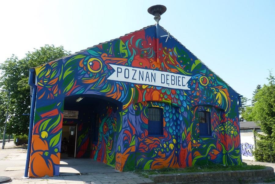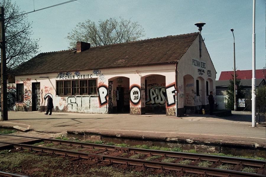 Poznań Dębiec - przejście między peronami, budynek stacyjny.