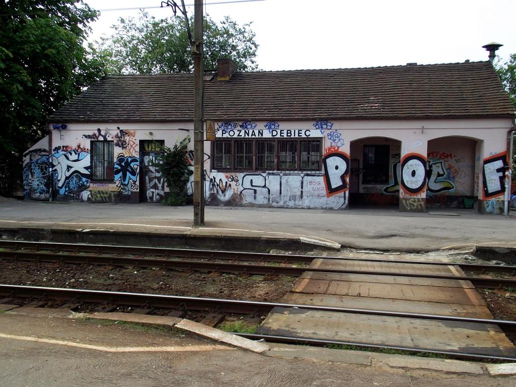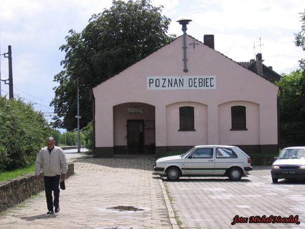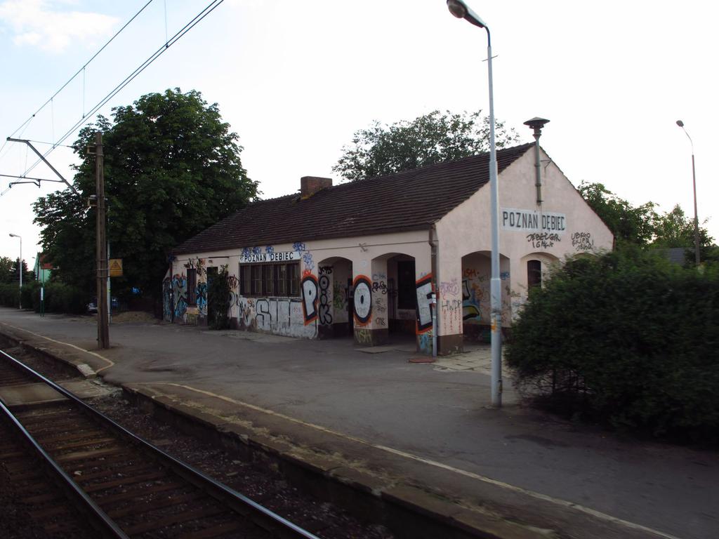 Poznań Dębiec, peron pierwszy oraz budynek stacyjny.