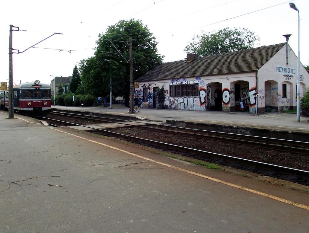 Poznań Dębiec - wjazd Regio relacji Leszno - Poznań Główny, budynek stacyjny.