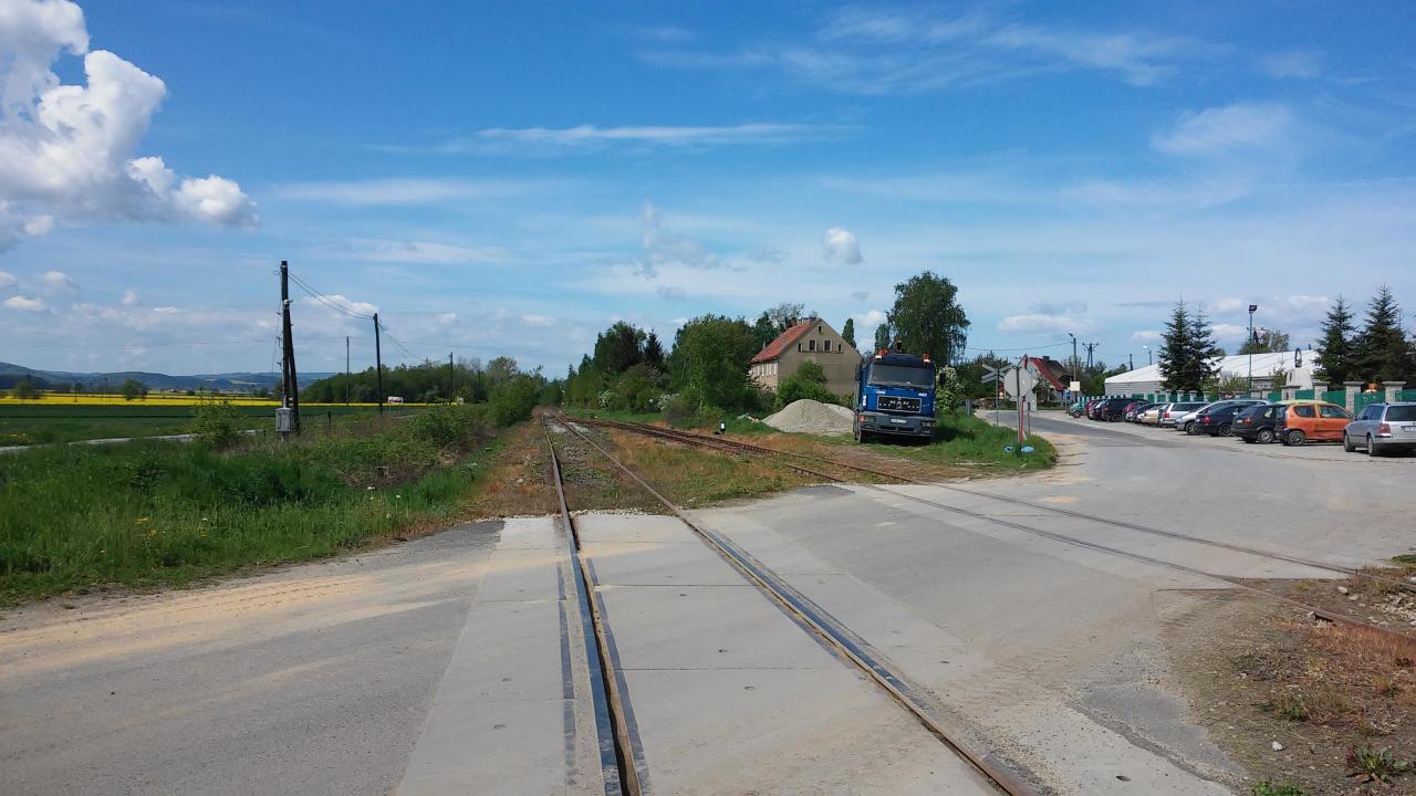 Przejazd kolejowy w obrębie stacji. Widok w kierunku Bolkowa.