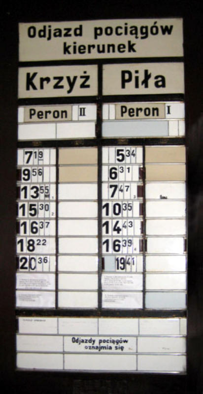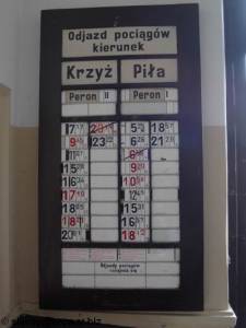 Stacja PKP Wieleń Północny. Aktualny rozkład w hali dworcowej. Zatrzymują się tylko pociągi osobowe relacji Krzyż - Piła i powrotne.