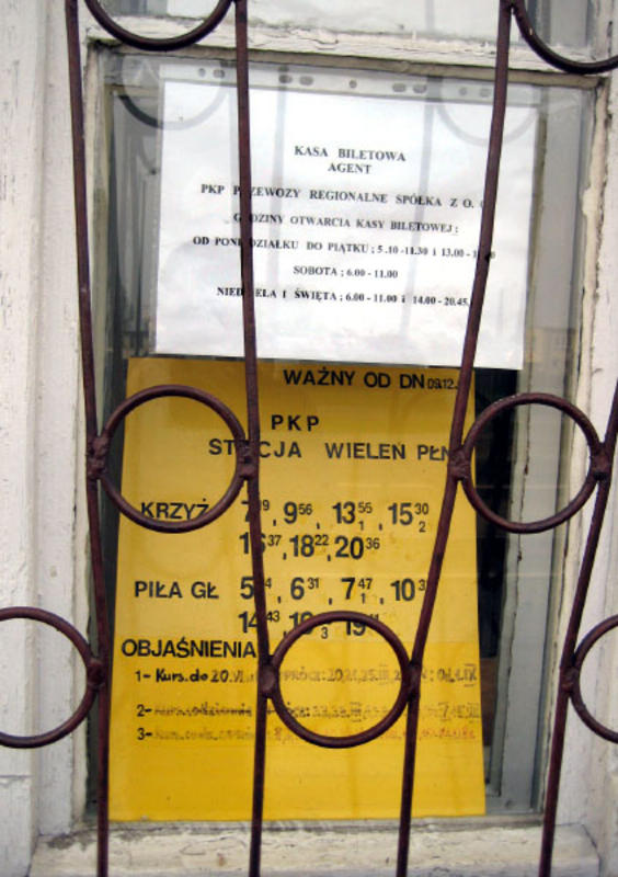 Przez zakratowane okno dostępny jest rozkład na zewnątrz budynku dworcowego.