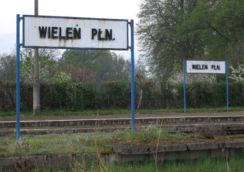 Wieleń Północny. Tablica z nazwą stacji i słupek kilometrowy na peronie od strony miasta.
