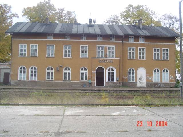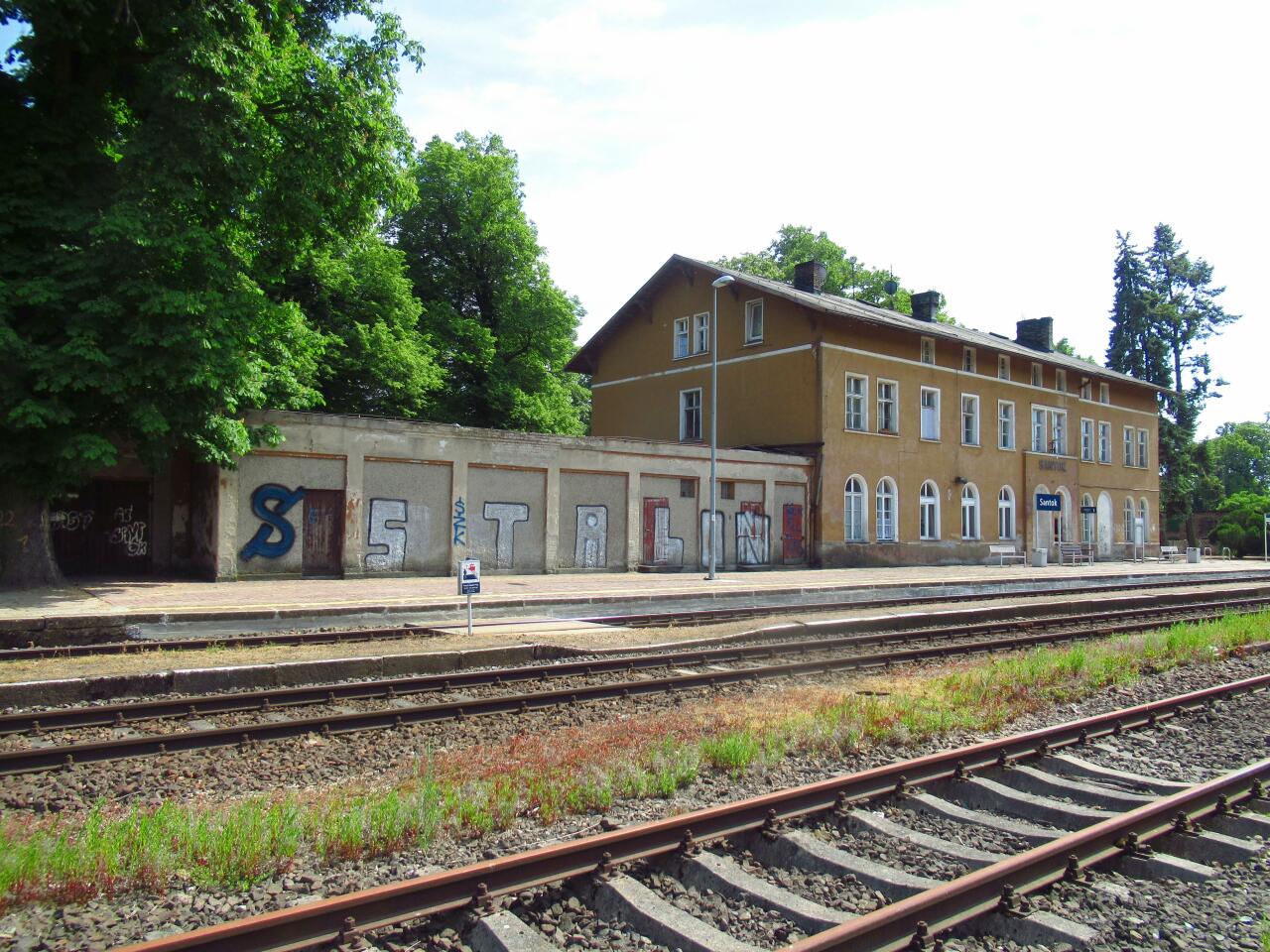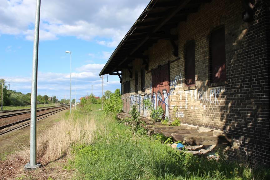 Budynek dworcowy widoczny od strony torów. Zamknięte wejście do nieczynnej poczekalni dla podróżnych. Tablica z nazwą stacji. W lewo Krzyż/Tczew, w prawo Gorzów Wielkopolski/Kostrzyn.