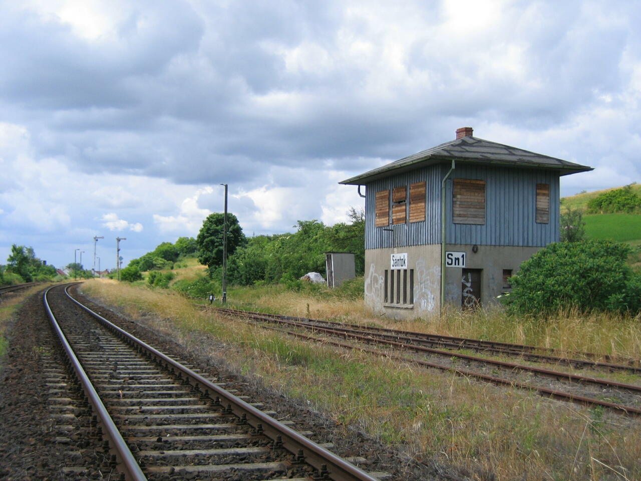 Nieczynna nastawnia wykonawcza w Santoku na wjeździe z Gorzowa Wielkopolskiego (za plecami). Widok w kierunku północno-wschodnim.