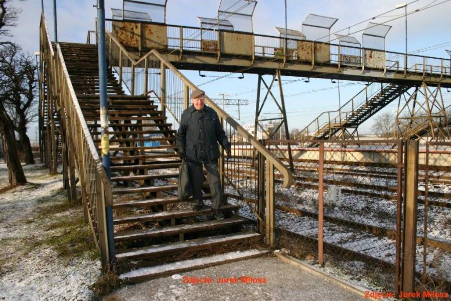 Peron przystanku i kładka. Po lewej prawdopodobnie budynek dworca. Zdjęcie z ulicy Zielonej Gęsi.