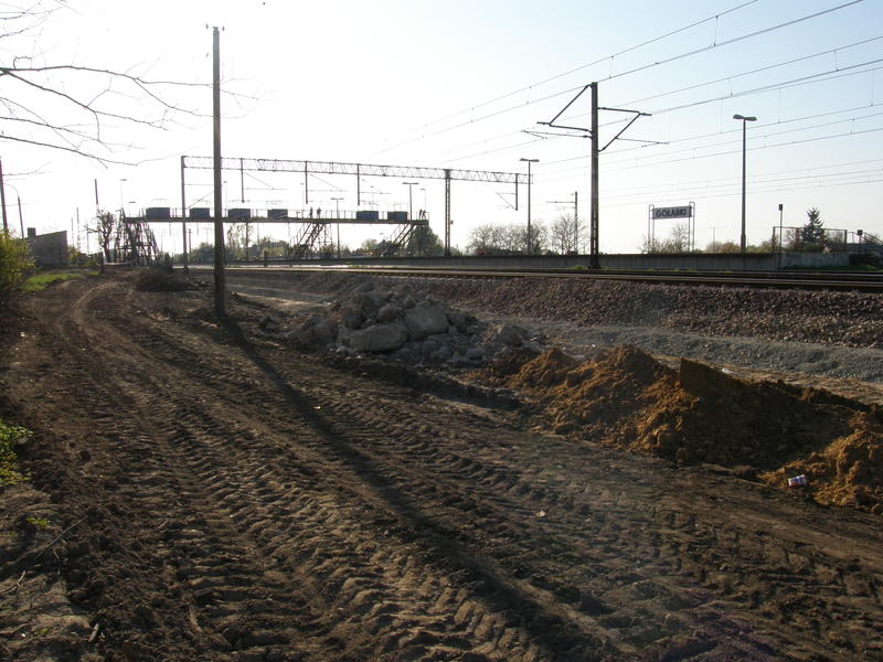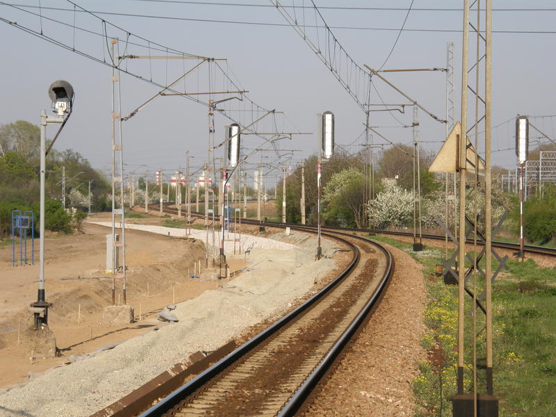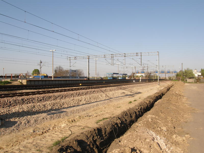 Widok w stronę Ożarowa Mazowieckiego. Rozjazdy stanowiące początek łącznicy Warszawa Główna Towarowa - Warszawa Gołąbki (tor nr 2 w przebudowie). W oddali budowa wiaduktu drogi ekspresowej.