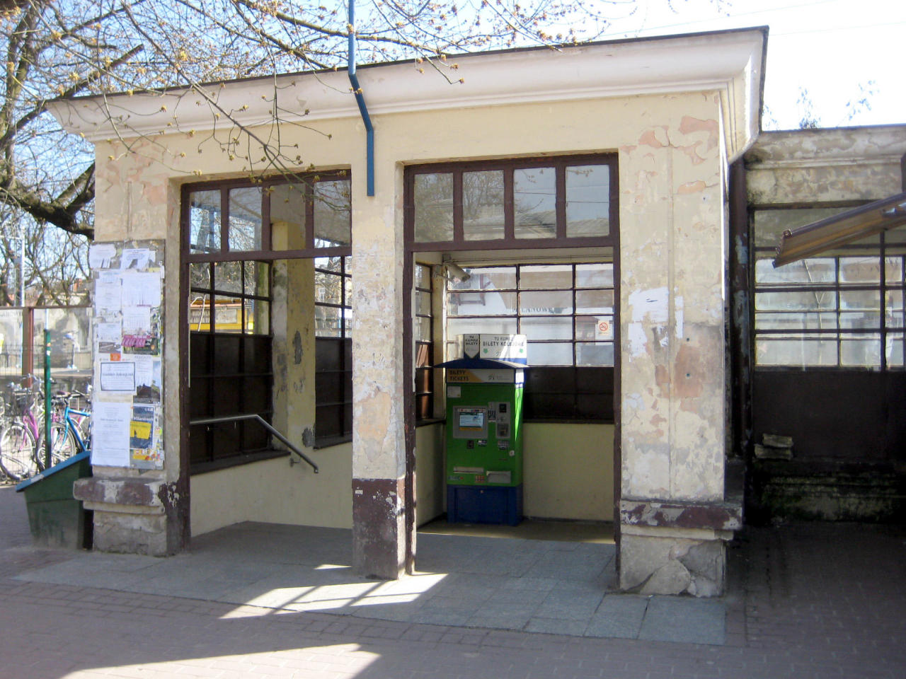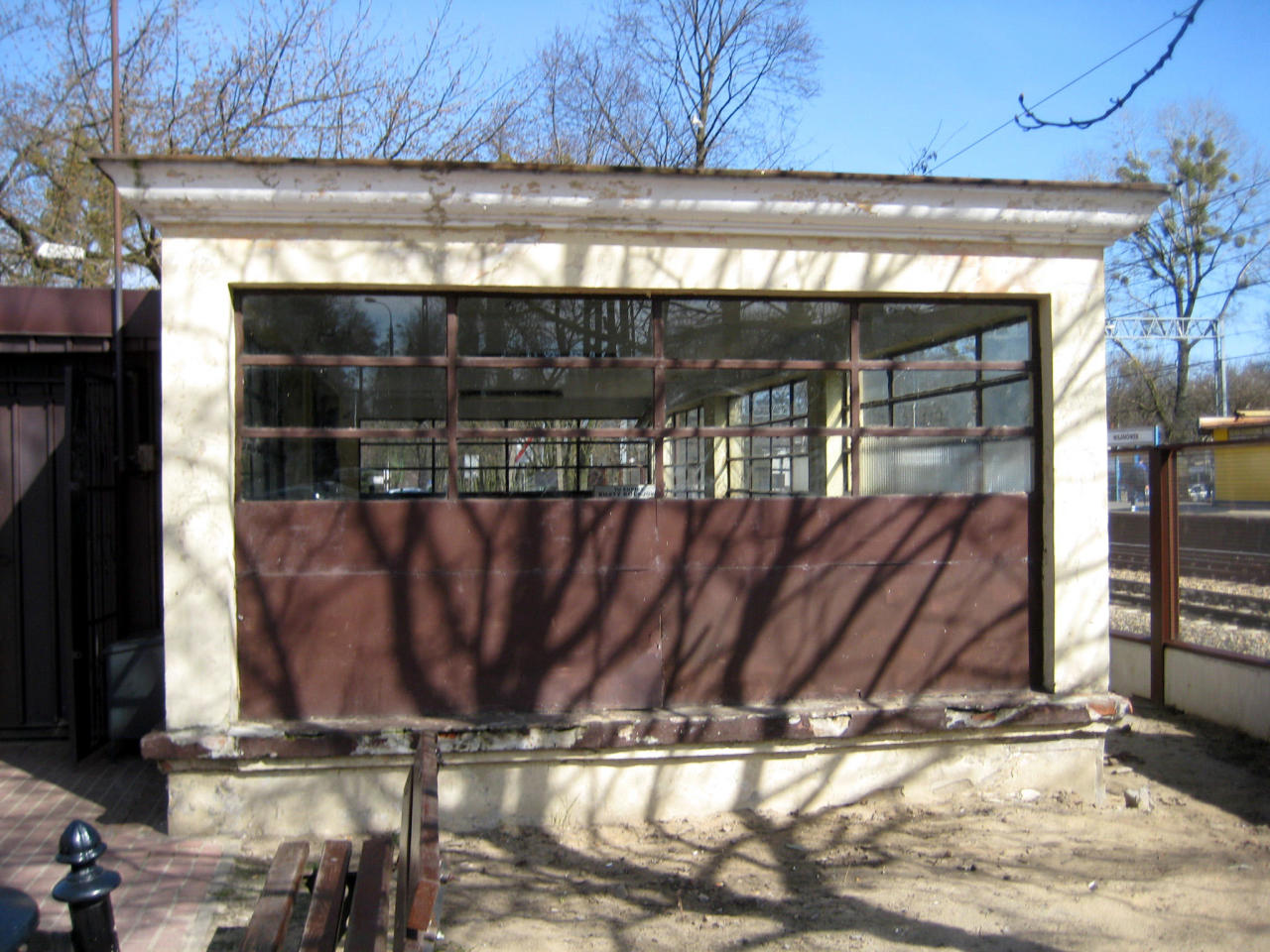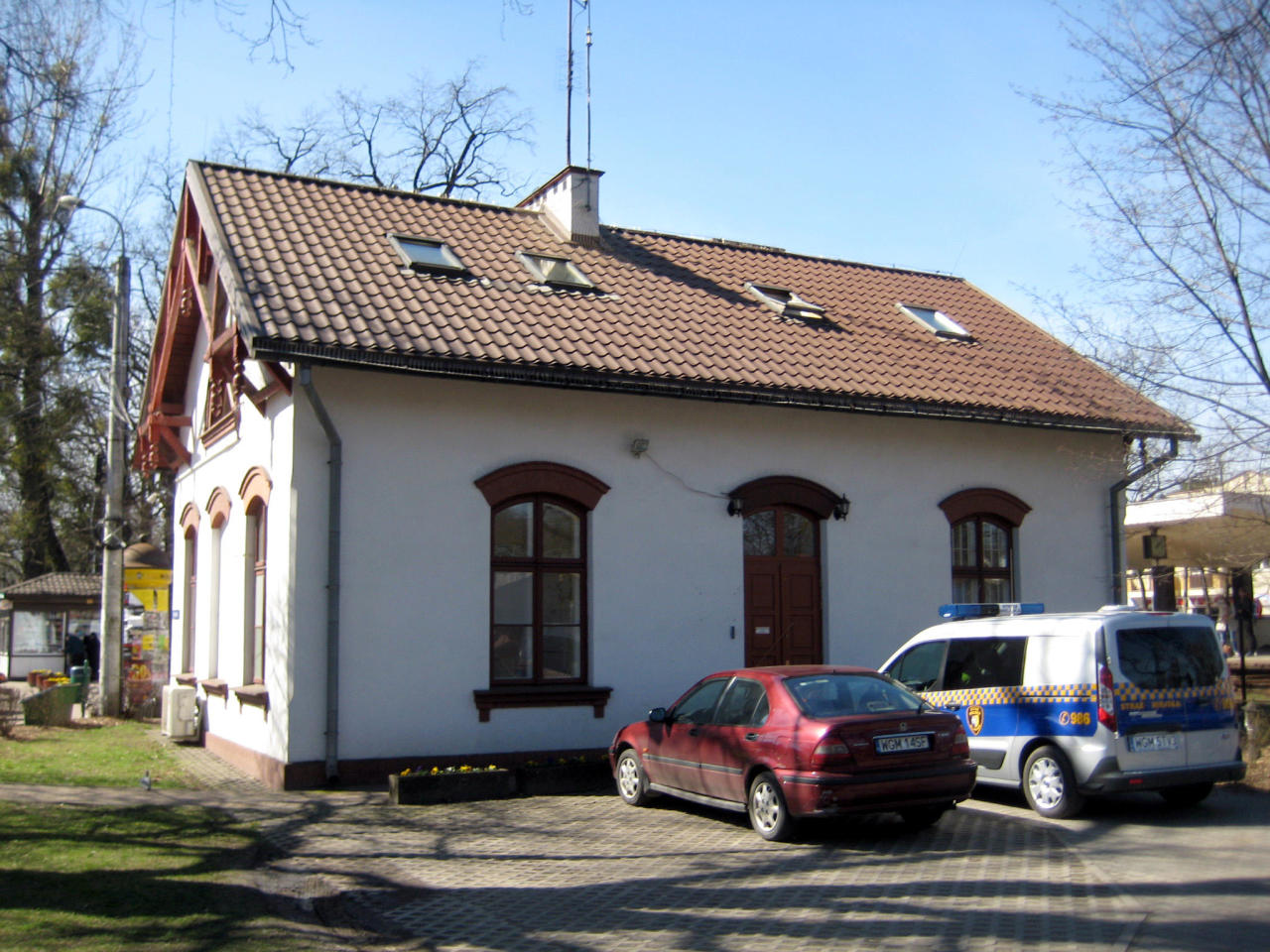 Stary budynek dworcowy z czasów Kolei Warszawsko-Wiedeńskiej. Obecnie siedziba Straży Miejskiej. Widok z peronu.