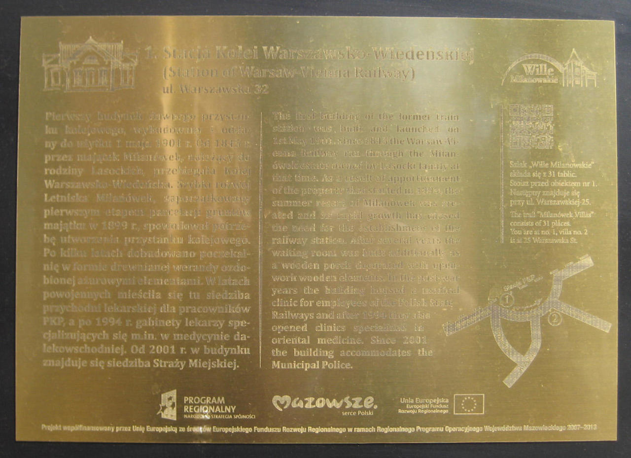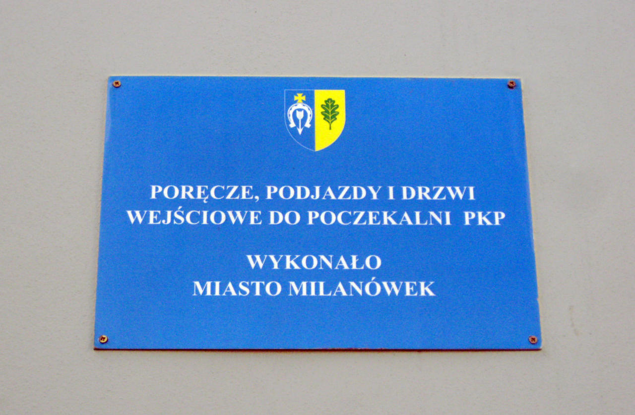 Tablica na starym budynku dworcowym zawierająca historię budynków dworcowych w Milanówku. Trochę mało czytelna.