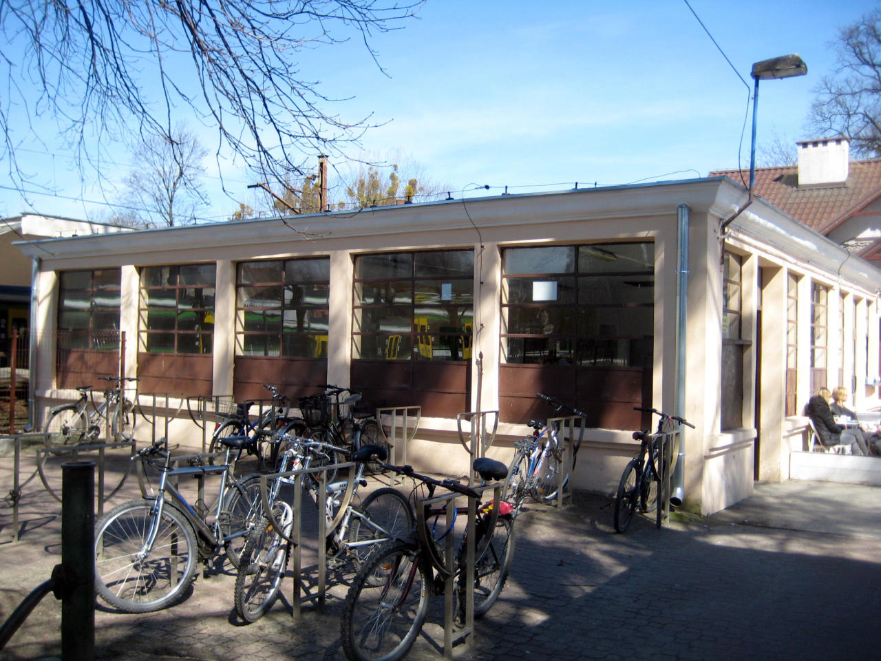 Obecny budynek dworcowy i przed nim parking rowerowy.