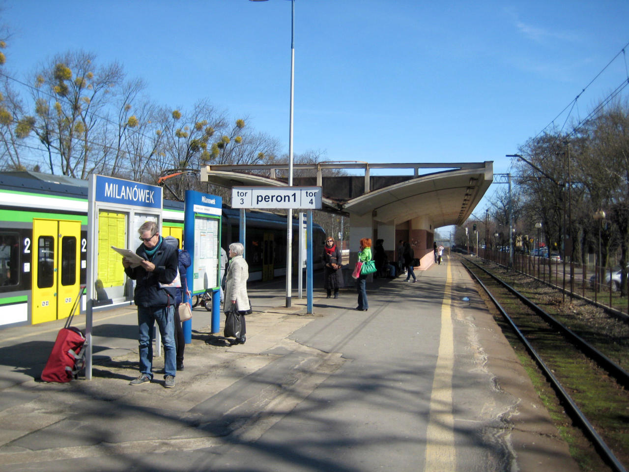 Peron w Milanówku, w tle dworzec i skład pociągu - nie tak nowoczesny jak infrastruktura stacji.
