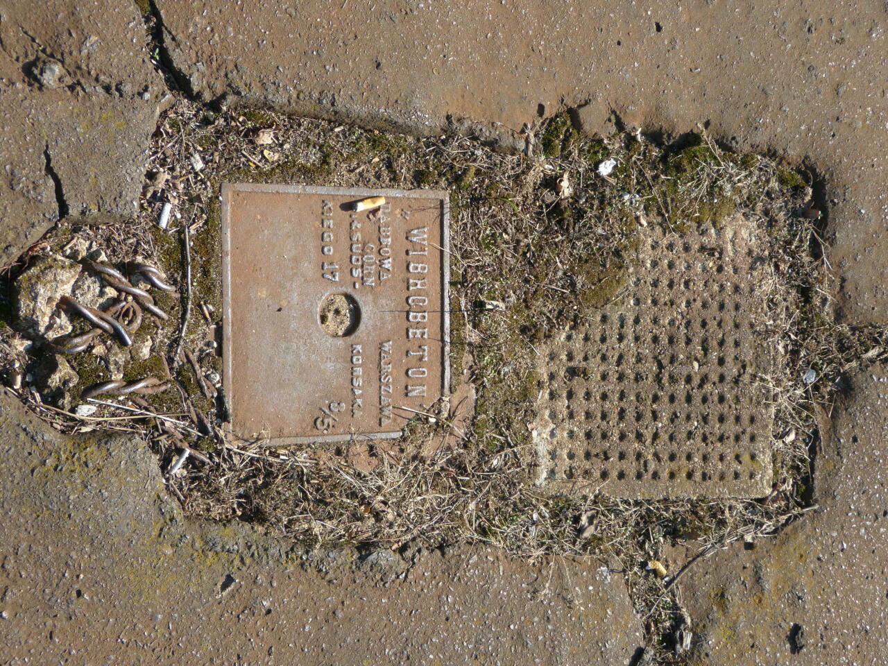 Oryginalna tabliczka producenta wyrobów betonowych, użytych przy budowie peronu i jego wyposażenia w latach 30-tych. Tabliczka widniała w nawierzchni przed modernizacją z lat 2017-18.
