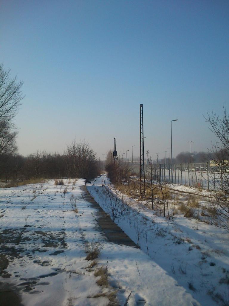 Gdańsk Brzeźno zimą, widok na tor w kierunku stacji od strony Zaspy Towarowej obok Wolnego Obszaru Celnego.