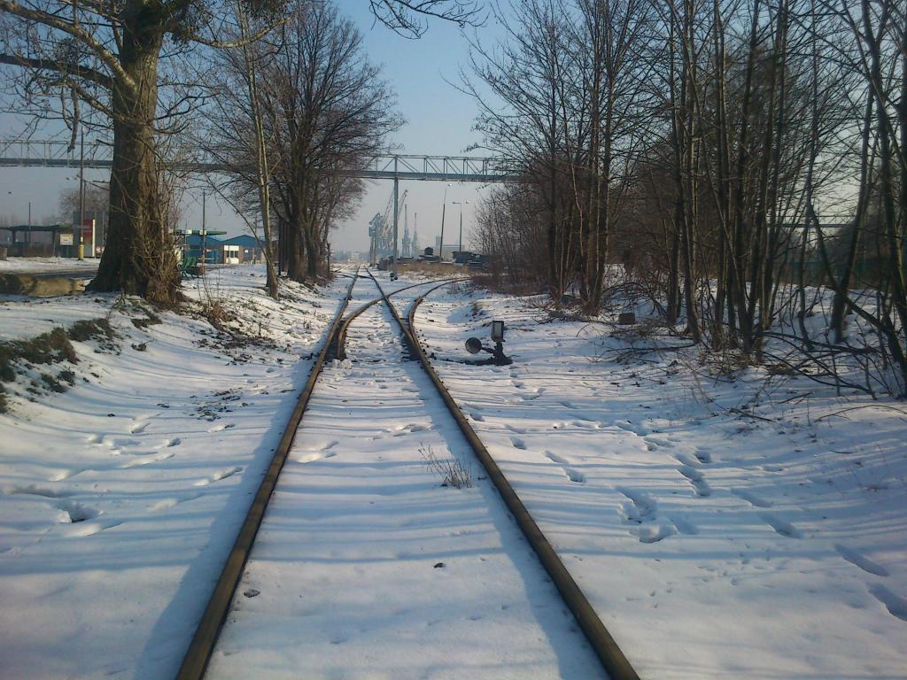 Gdańsk Brzeźno zimą, tory w kierunku nabrzeża portowego, rozjazd na Nowy Port.