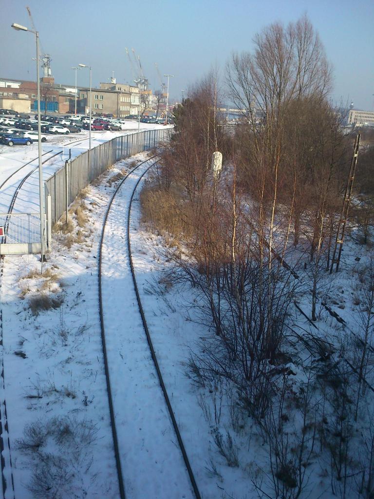 Gdańsk Brzeźno zimą, tory w kierunku nabrzeża portowego.