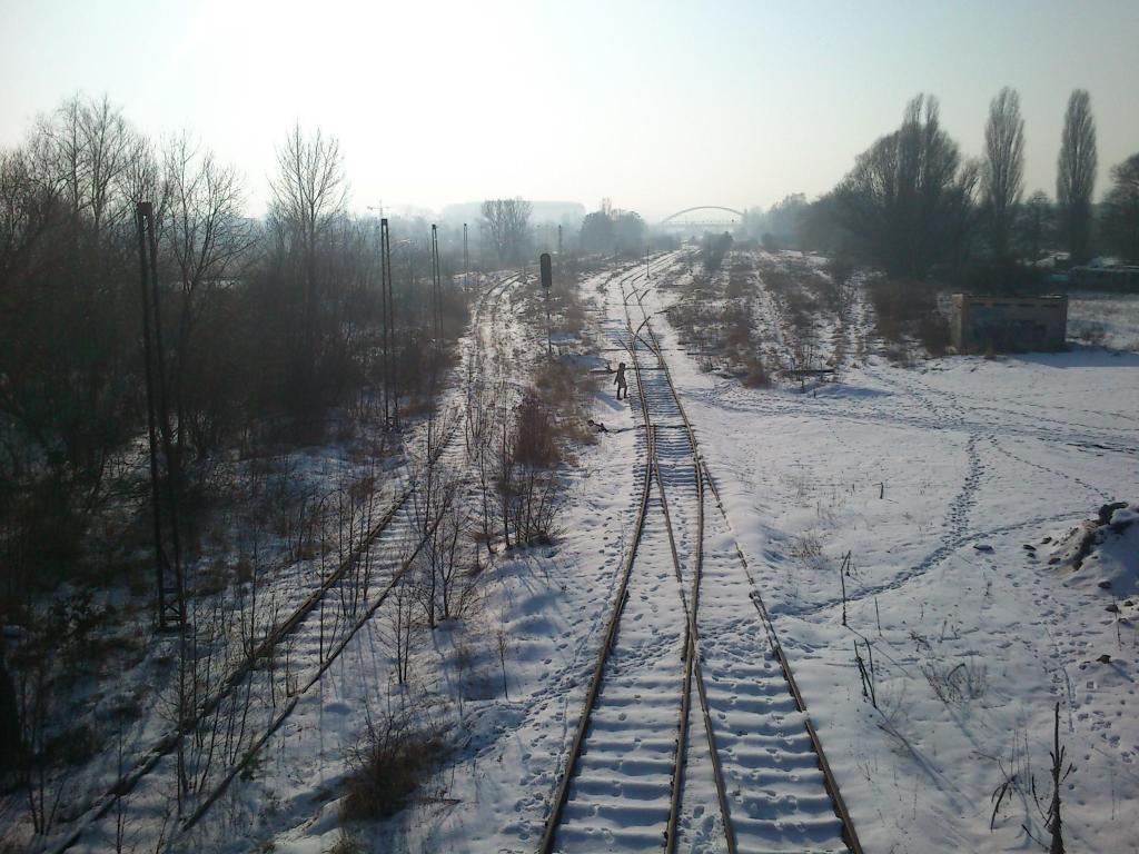 Gdańsk Brzeźno zimą, widok spod wiaduktu w stronę Zaspy Towarowej.