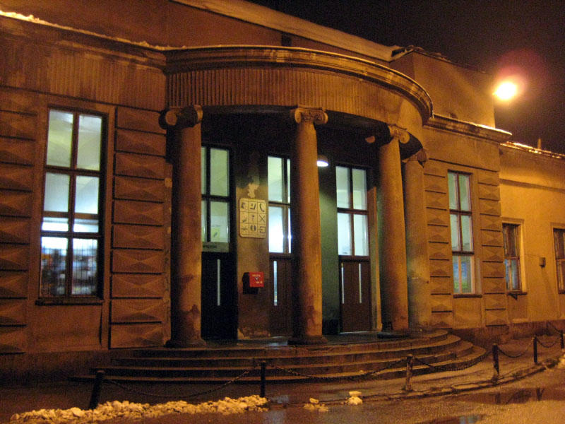 Stacja PKP Radomsko. Nocne ujęcie drzwi wejściowych do budynku dworcowego od strony miasta.