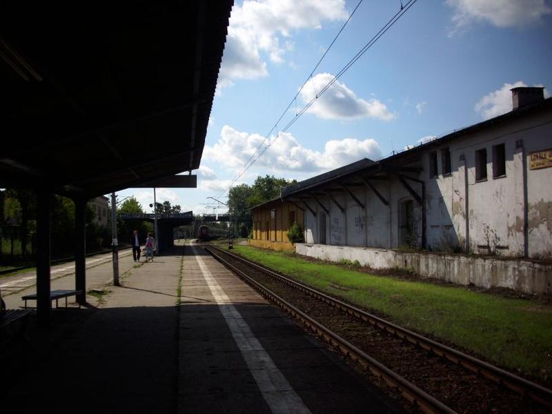 W tle po lewo widać dawny budynek stacyjny (malowany na żółto) obecnie mieści się w nim punkt skupu złomu. Na stacji stoi EU07-177 z pociągiem Zamenhof relacji Białystok - Bielsko Biała Główna