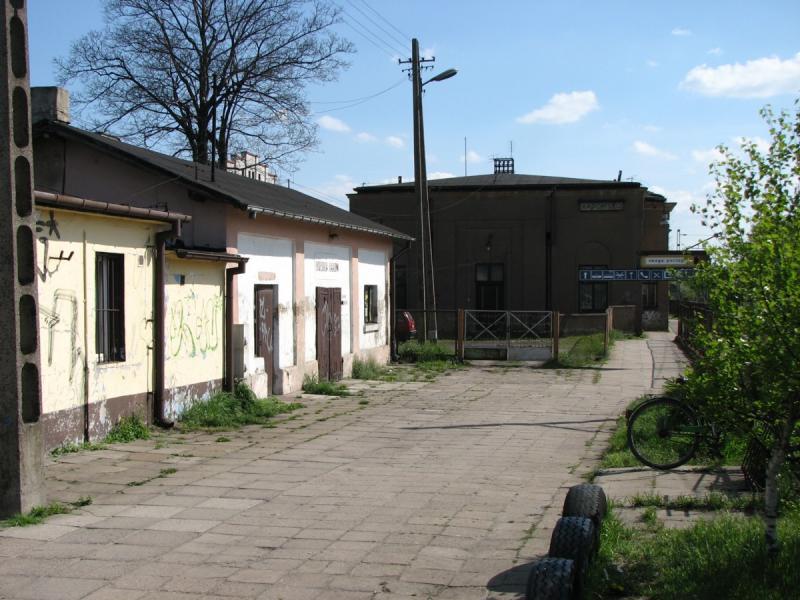 po prawej stronie widać dawne budynki stacyjne obecnie w jednym z nich mieści się skup złomu natomiast pozostała część jest do wynajęcia. W tle widać odjeżdżający pociąg Zamenhof (Relacja Białystok - Bielsko Biała Główna)