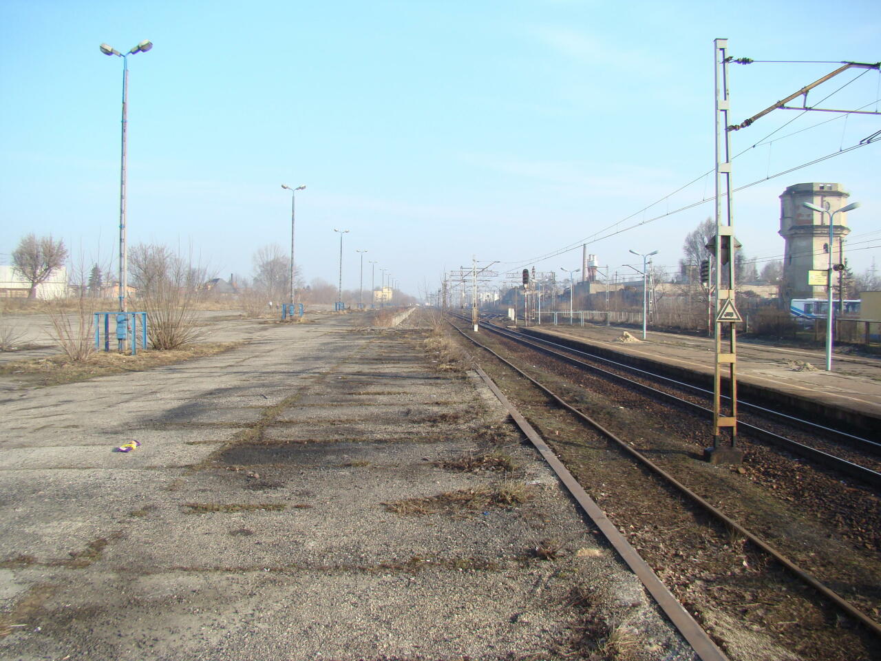 Radomsko, km 189,0. Rampa-plac ładunkowy, peron i wieża wodna. Widok w kierunku Koluszek.