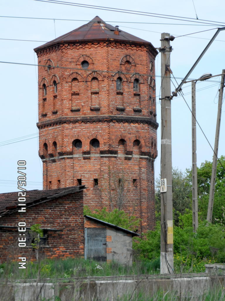Radliczyce. Wieża wodna od strony torów z kilometrażem na słupie.