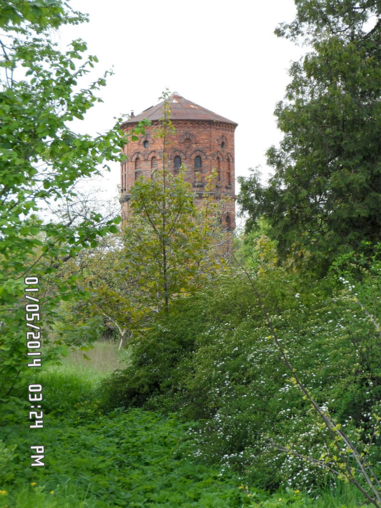 Radliczyce. Jeszcze raz wieżą wodna z bujną zielenią.