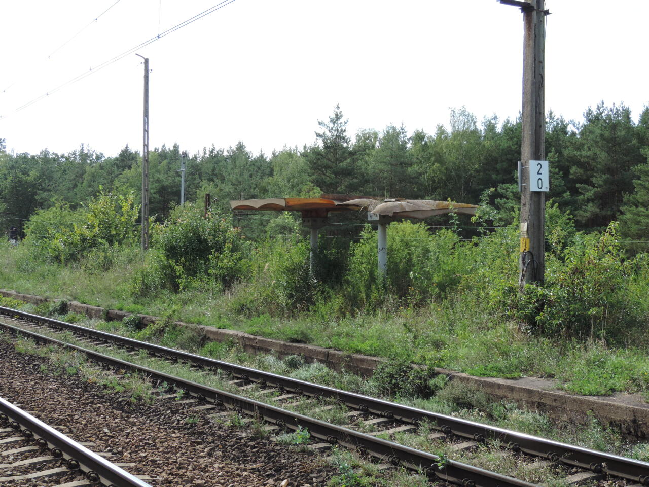Na peronach dawnej stacji Nowa Wieś Poznańska króluje krajobraz tropikalny. Na zdjęciu widoczne stare wiaty peronu przy torze w kierunku Poznania Franowo.