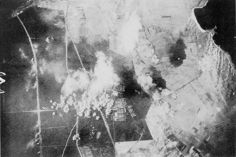 Zdjęcie lotnicze sprzed bombardowania. Widoczny budynek magazynu stacji kolejowej (lewa strona zdjęcia).