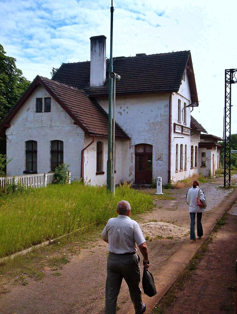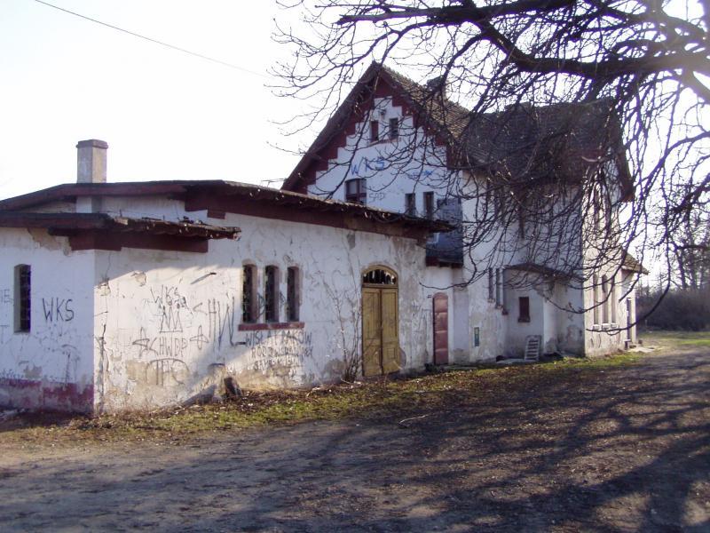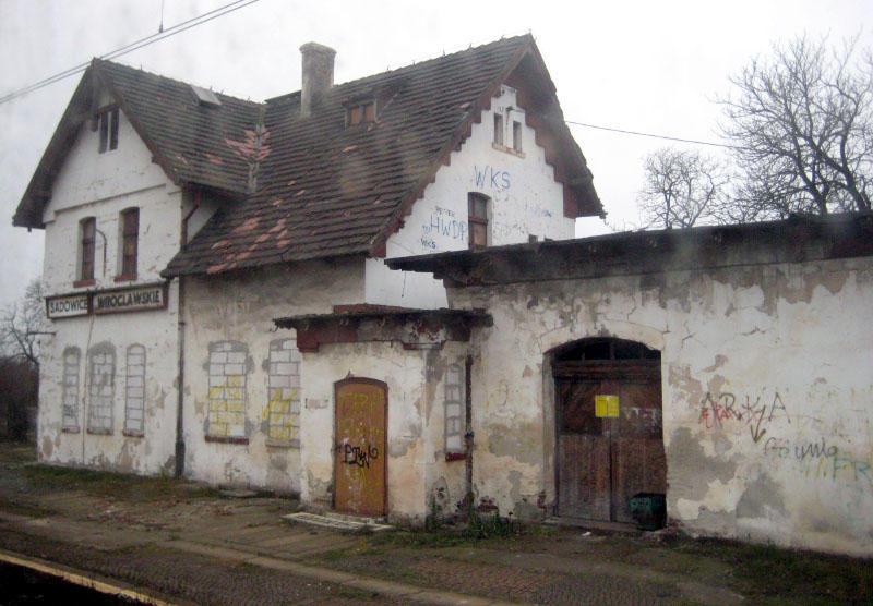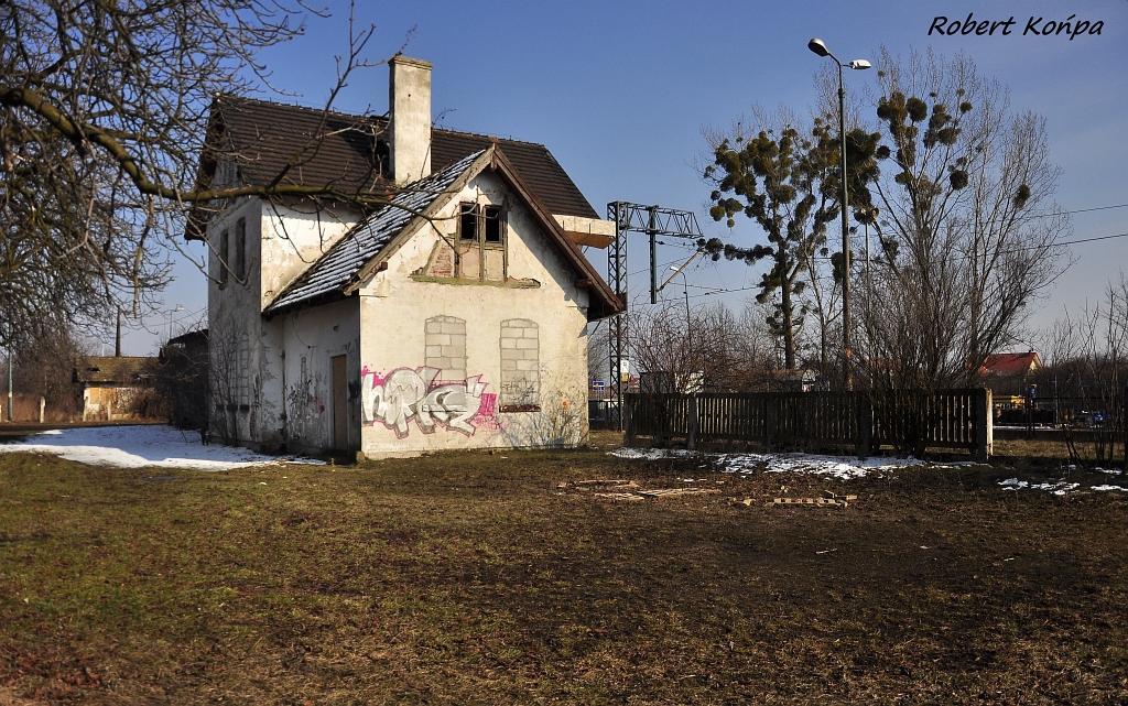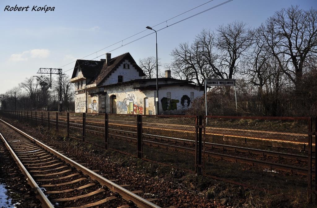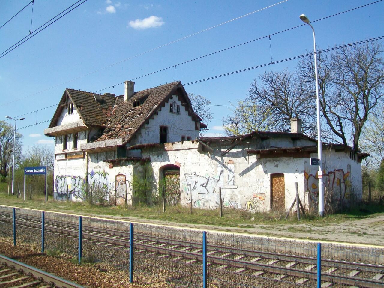 Opuszczony od około 20 lat budynek dworcowy, stojący wraz z magazynem towarowym przy peronie 2. Widok w kierunku północno-zachodnim (w lewo Jaworzyna Śląska, w prawo Wrocław).