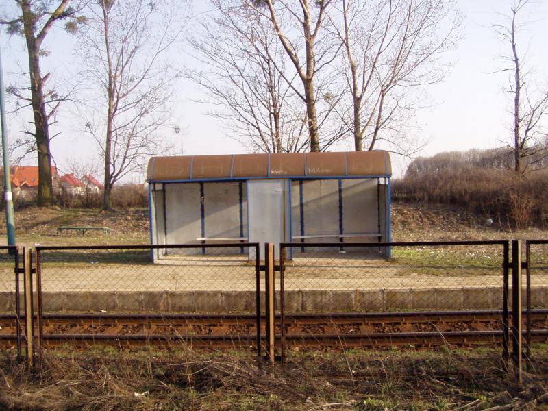 Infrastruktura dla pasażerów na peronie 2. W lewo (poza kadrem) magazyn towarowy i budynek dworca. Za wiatą - stacyjne kibelki. Widok w kierunku północnym (w lewo Jaworzyna Śląska, w prawo Wrocław).
