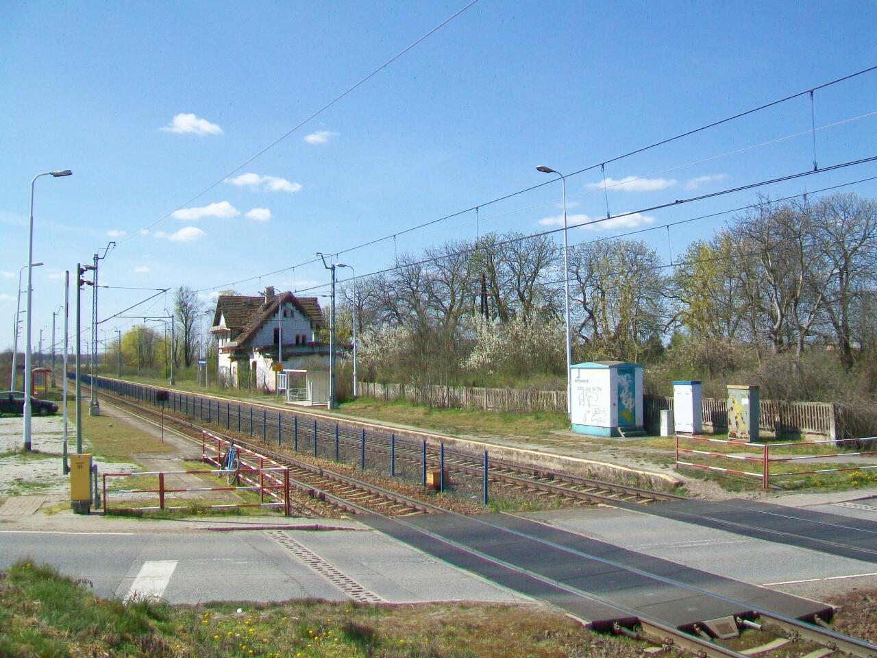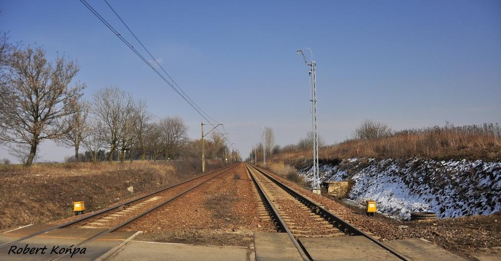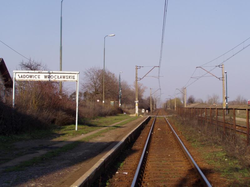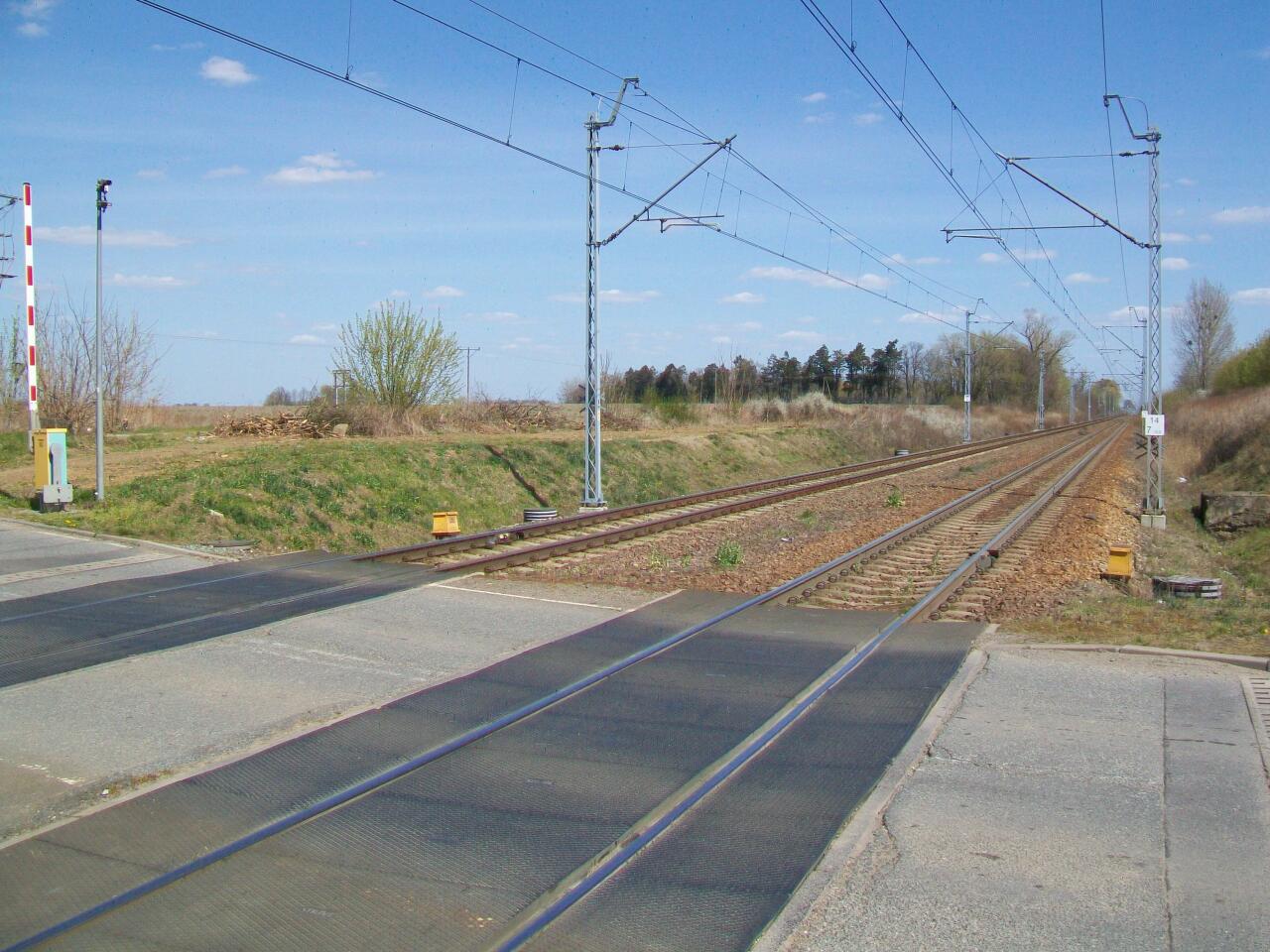 Przejazd kolejowy na szosie łączącej Sadków (w prawo) z Sadowicami. Widok w kierunku północno-wschodnim (Wrocław).