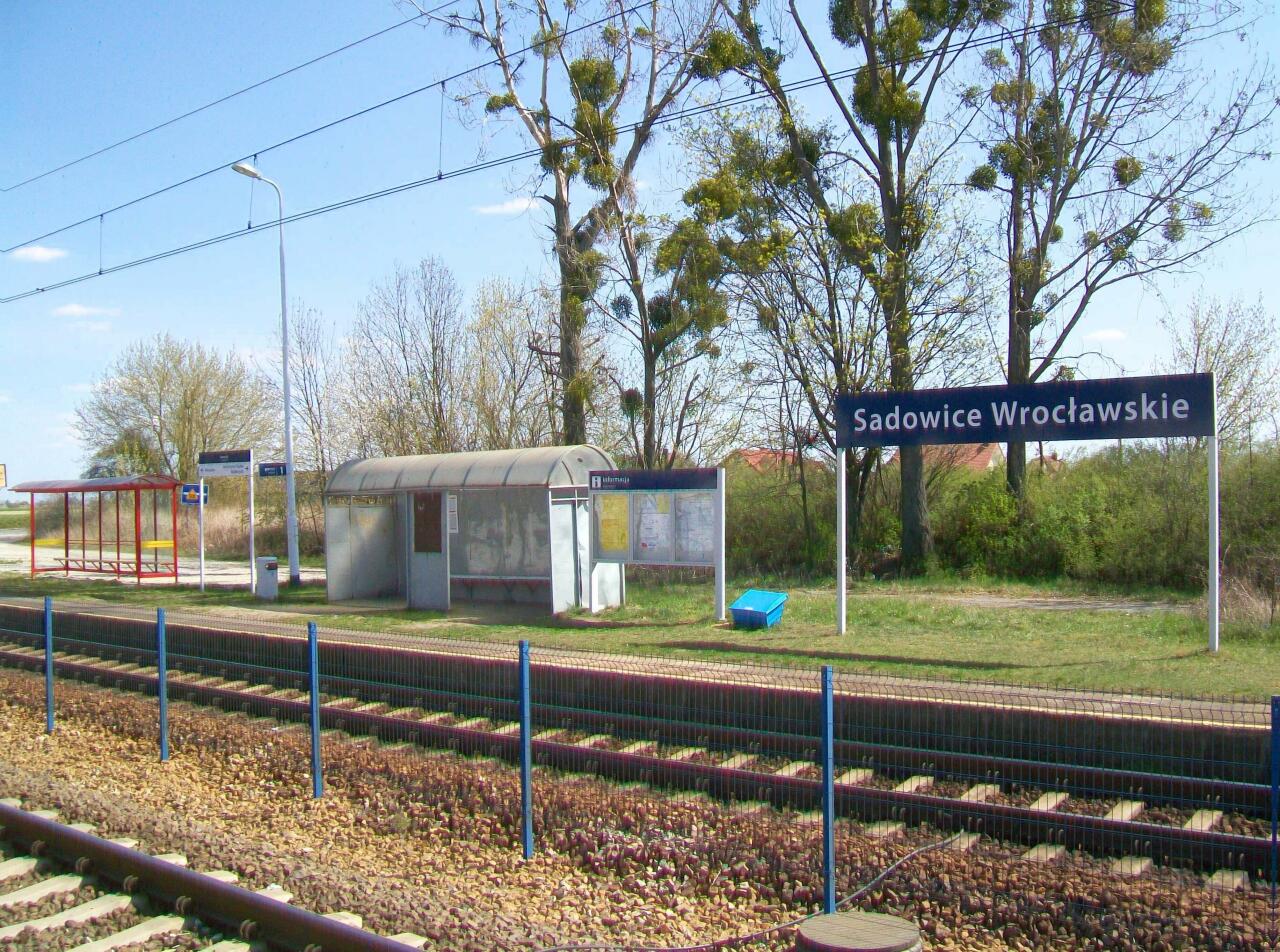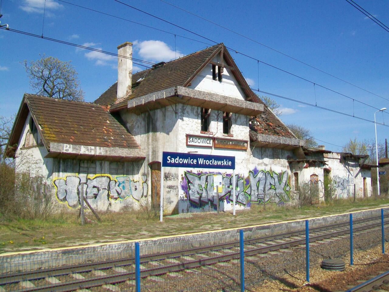 Przystanek PKP Sadowice Wrocławskie. Budynek dworcowy. Widok z pociągu zdążającego w kierunku Wrocławia.
