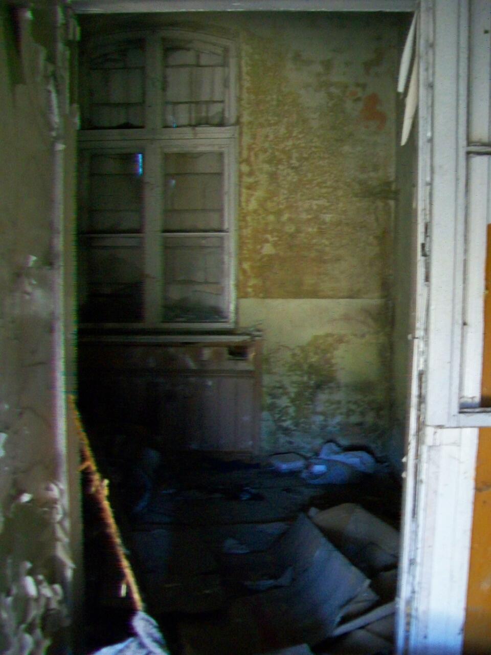 Zdewastowane, zaśmiecone wnętrze budynku dworca. Tutaj prawdopodobnie była poczekalnia.