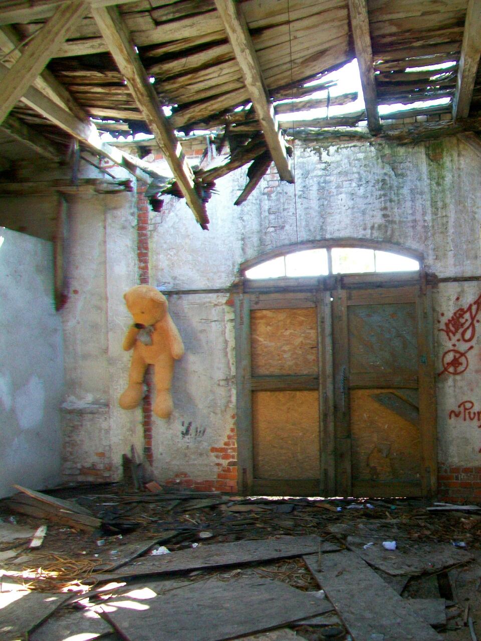 Zdewastowane wnętrze magazynu towarowego, stojącego przy budynku dworca (z prawej).
