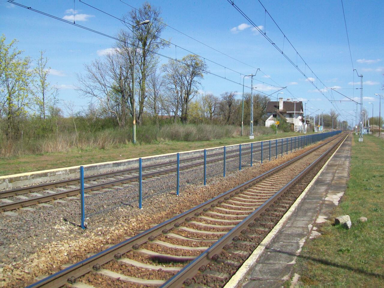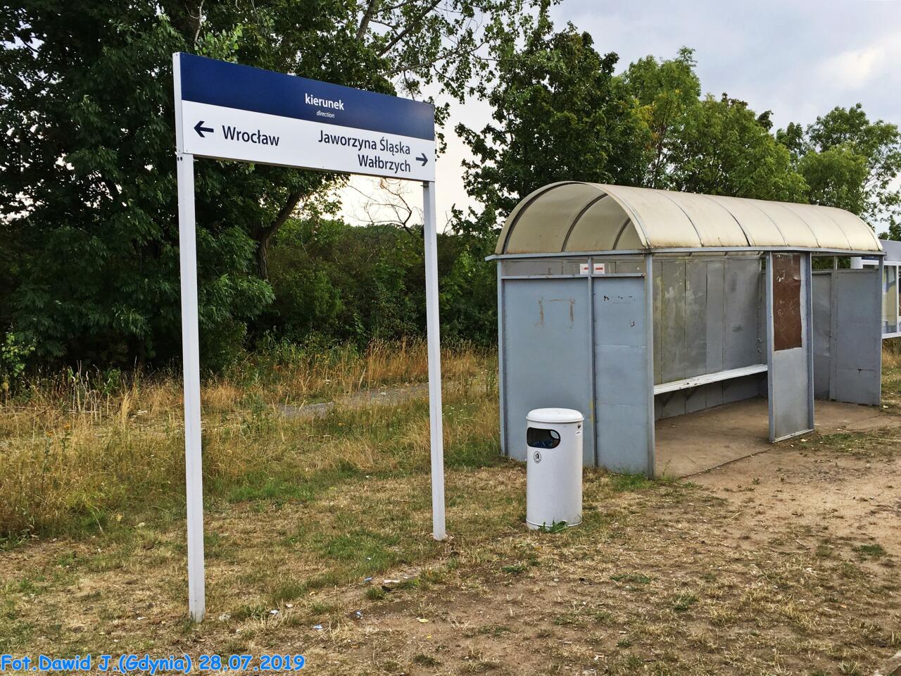 Wjazd na przystanek od strony Jaworzyny Śląskiej. Na pierwszym planie peron 1. W tle, stojący przy peronie 2, opuszczony budynek dworca. Widok w kierunku północno-wschodnim (Wrocław).