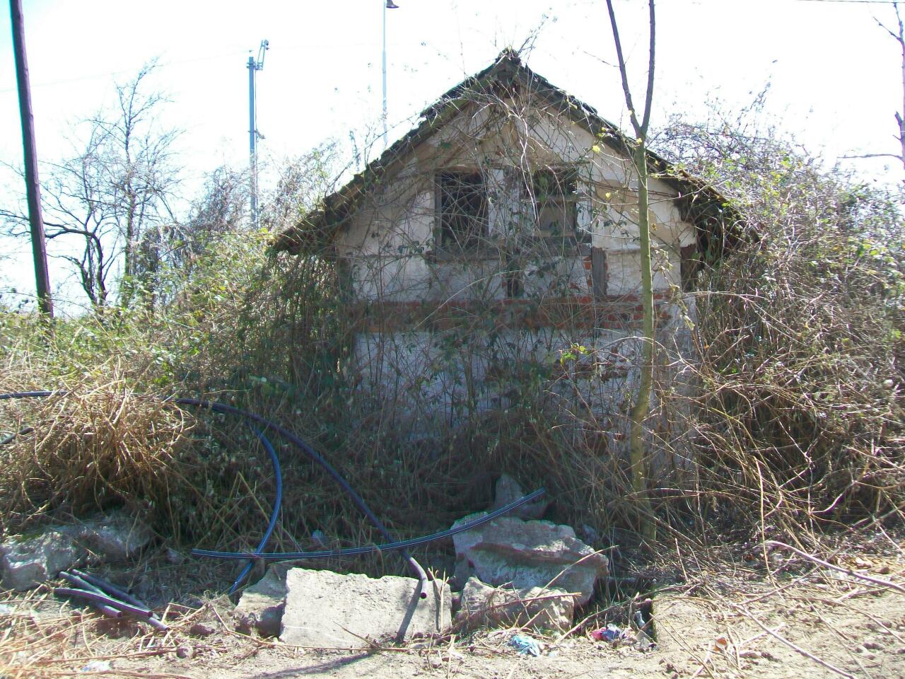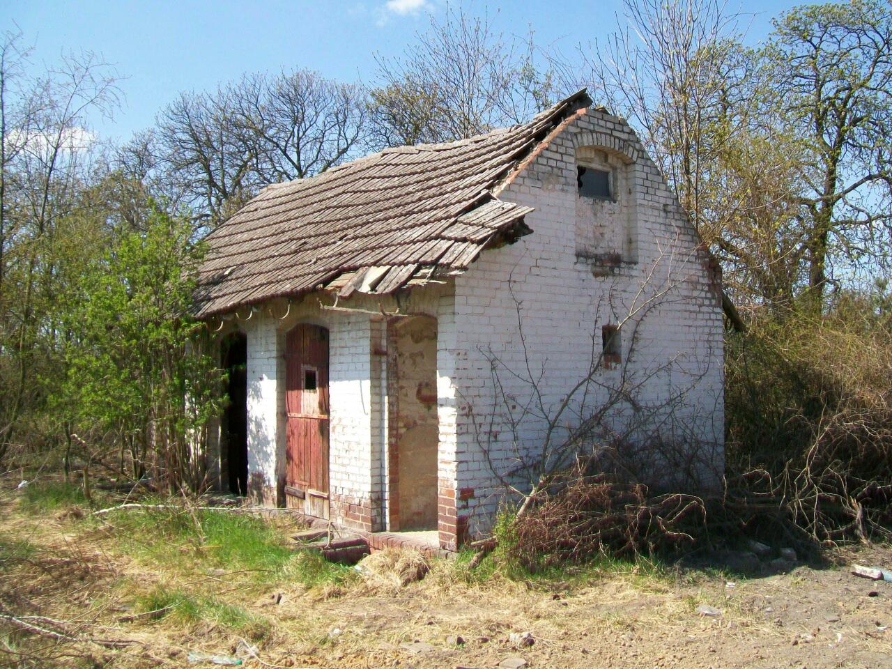 Popadający w ruinę budynek gospodarczy, opodal peronu 2 (w lewo). Widok od strony przejazdu kolejowego w kierunku zachodnim.