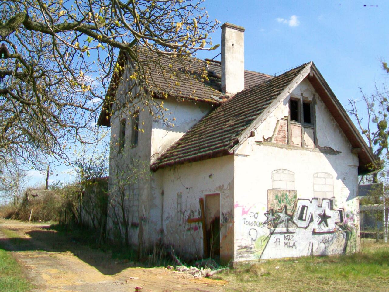 Widok na zdewastowany i opuszczony już w całości budynek dworca.