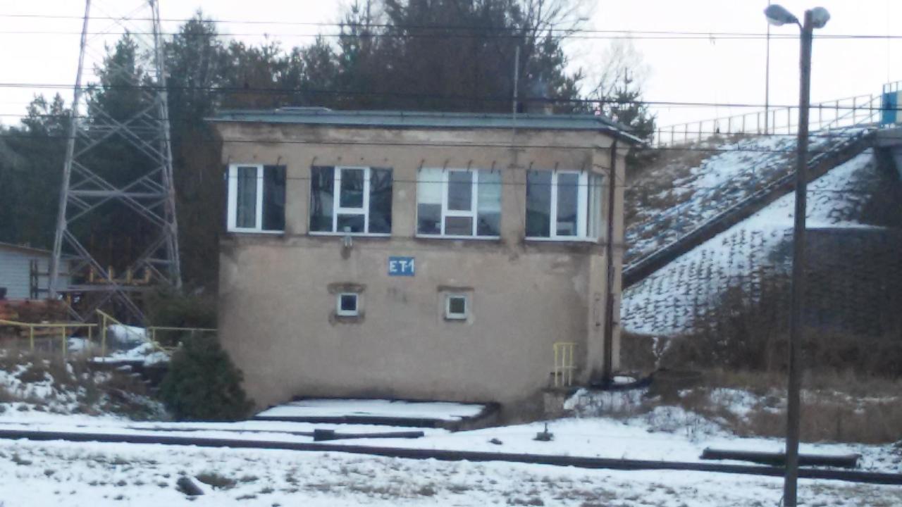 Stojąca w południowej części stacji Ełk Towarowy, tuż przy wiadukcie drogowym w ciągu ul. Przemysłowej, nastawnia wykonawcza ET-1. Widok w kierunku wschodnim.
