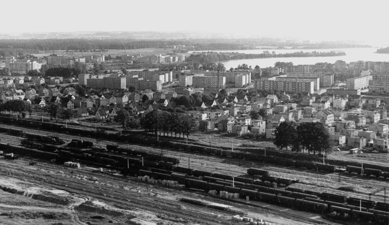 Widok lotniczy stacji w 1989 r w kierunku zachodnim. W lewo Giżycko, Olecko, Orzysz, w prawo Białystok, Pisz. W tle zabudowa miasta.