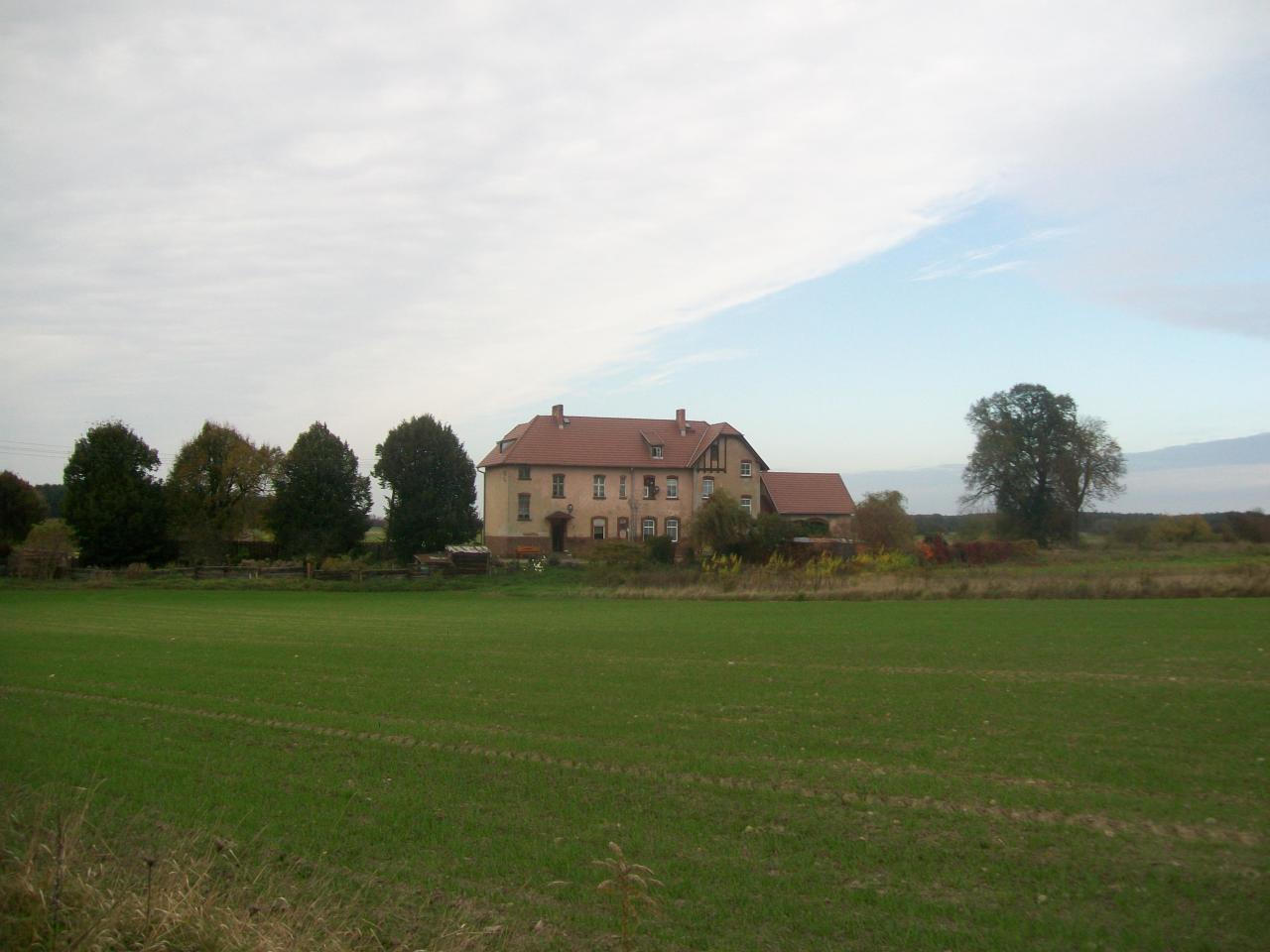 Widok na budynek dworca od strony wsi w kierunku północnym; w prawo Konotop i Wolsztyn, w lewo Nowa Sól.